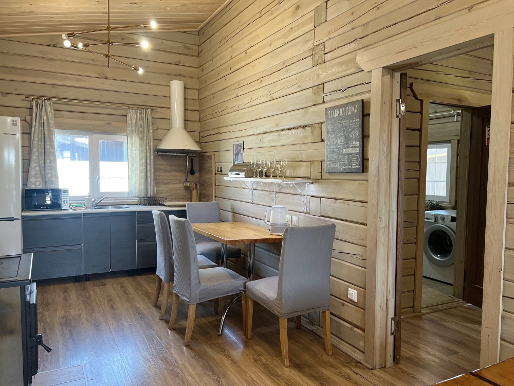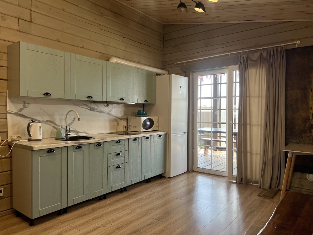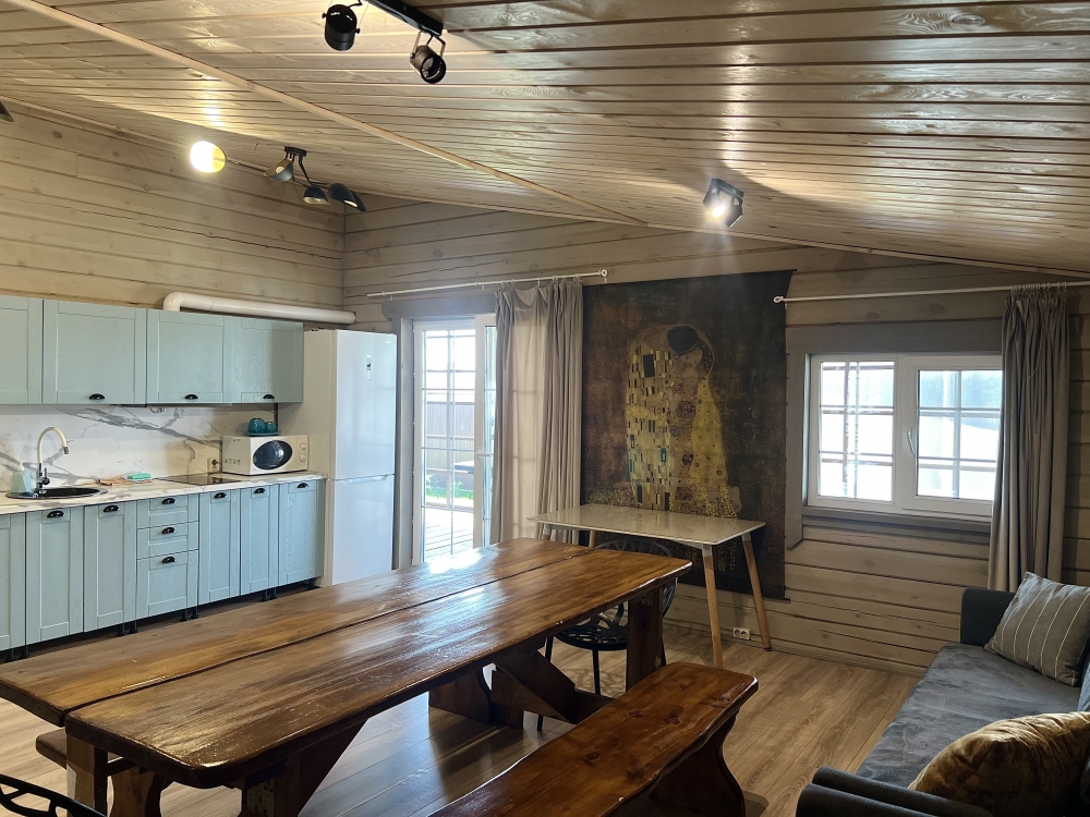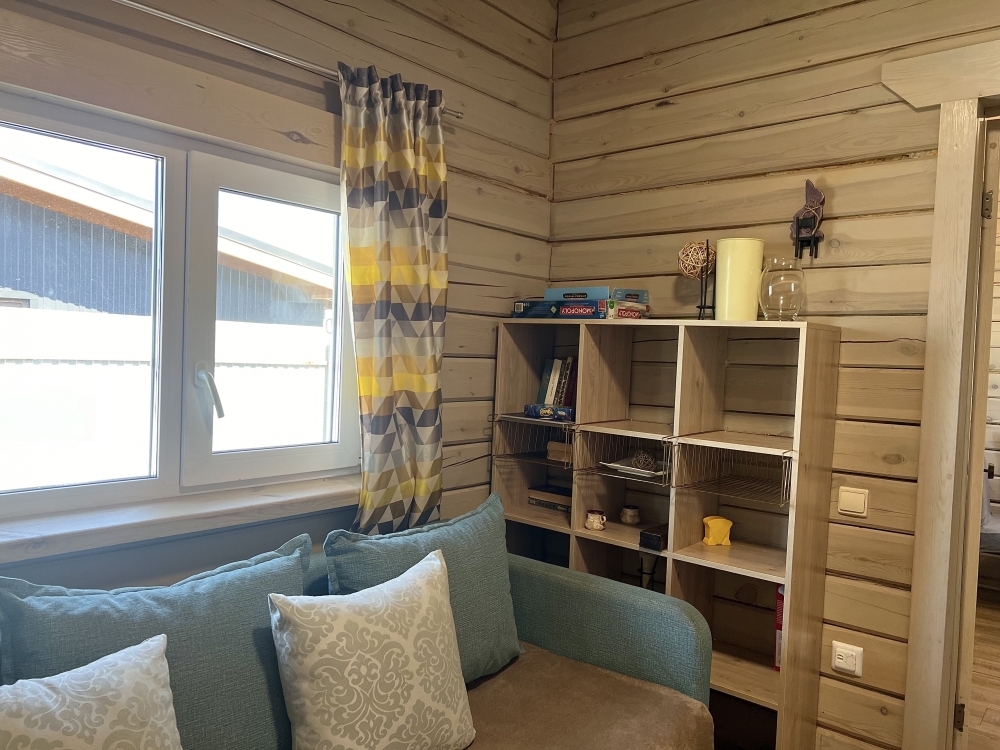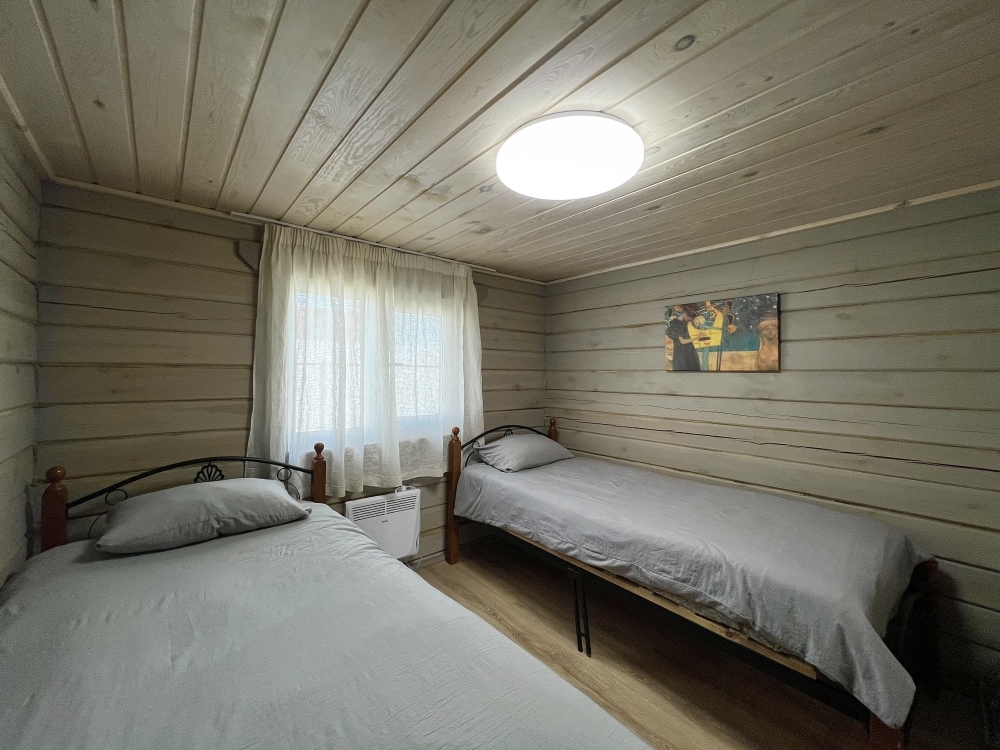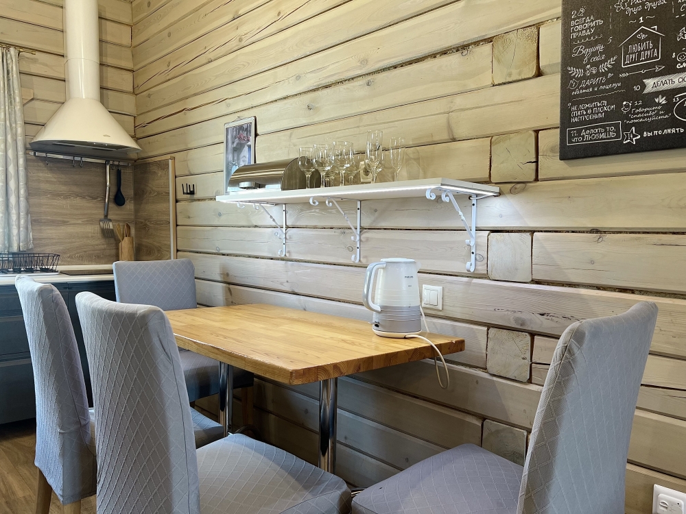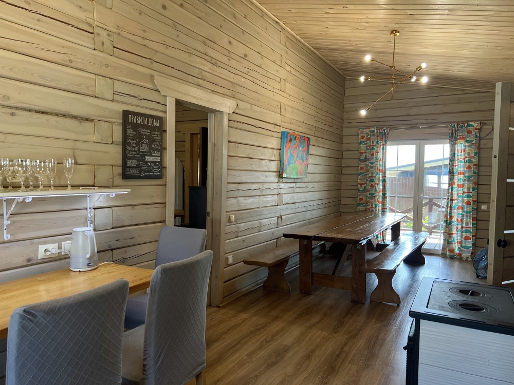 Светлый и просторный дом для отдыха на природе с террасой и качелью. Дом из натурального дерева, расположен на участке 6 соток, в нем есть всё необходимое для комфортного пребывания гостей. Дом полностью огорожен забором имеет свою парковку на несколько машин. В доме 2 отдельные спальни, большая кухня гостиная. Имеется вся необходимая посуда, чайник, микроволновая печь, индукционная плита, холодильник, телевизор, большой обеденный стол со скамьями, постельное белье, полотенца, чай, мыло, шампунь, тапочки, туалетные принадлежности.