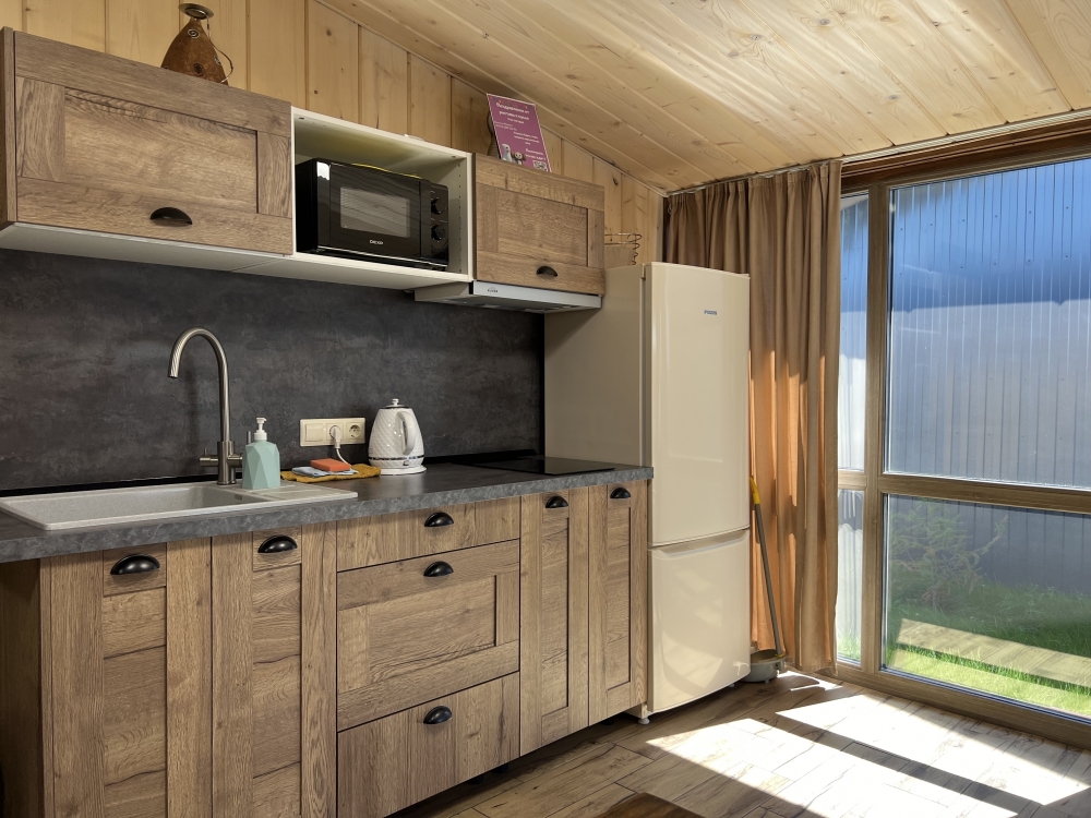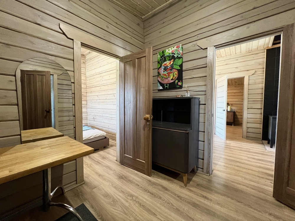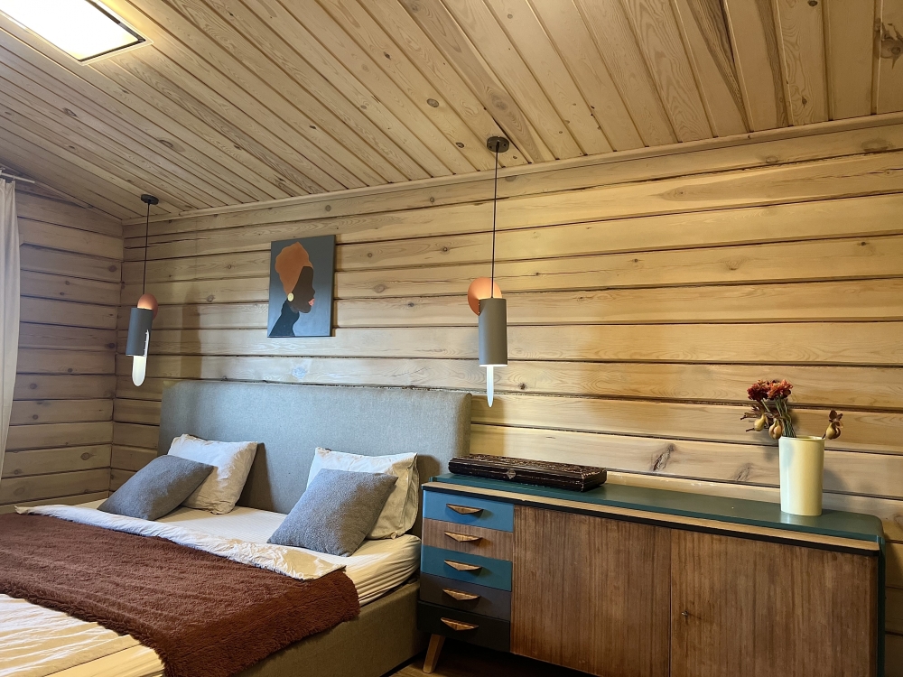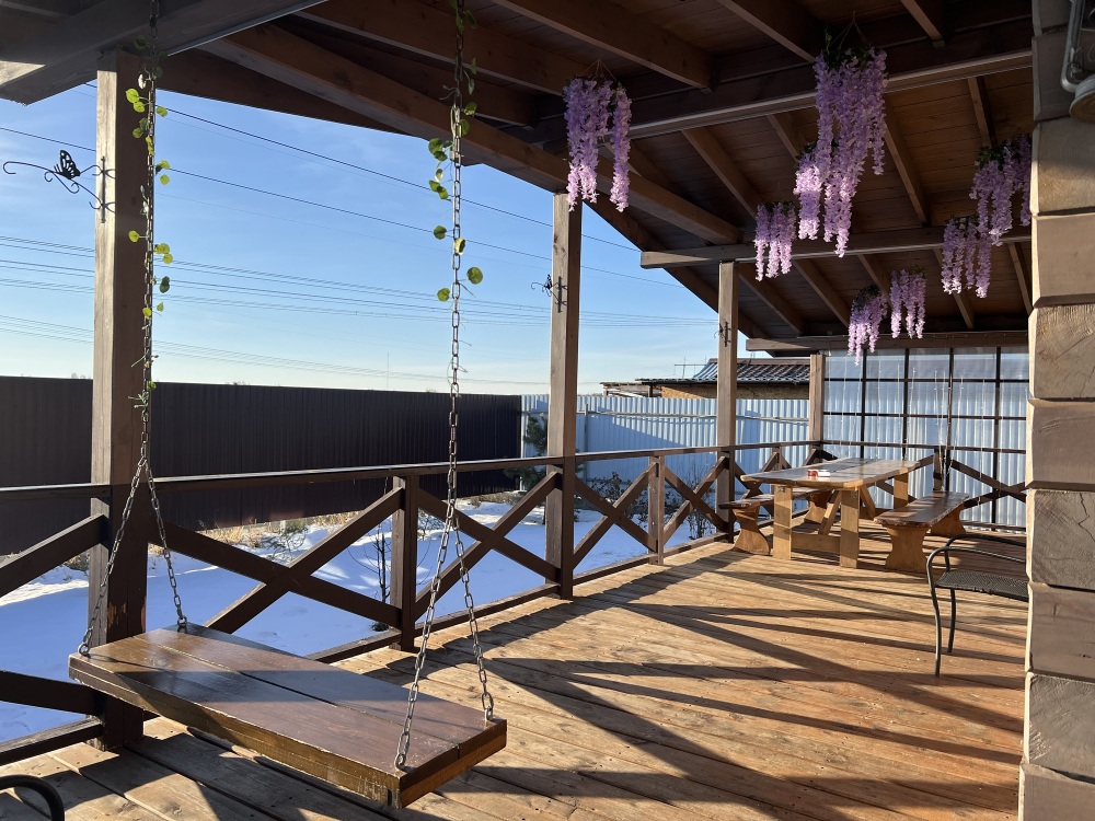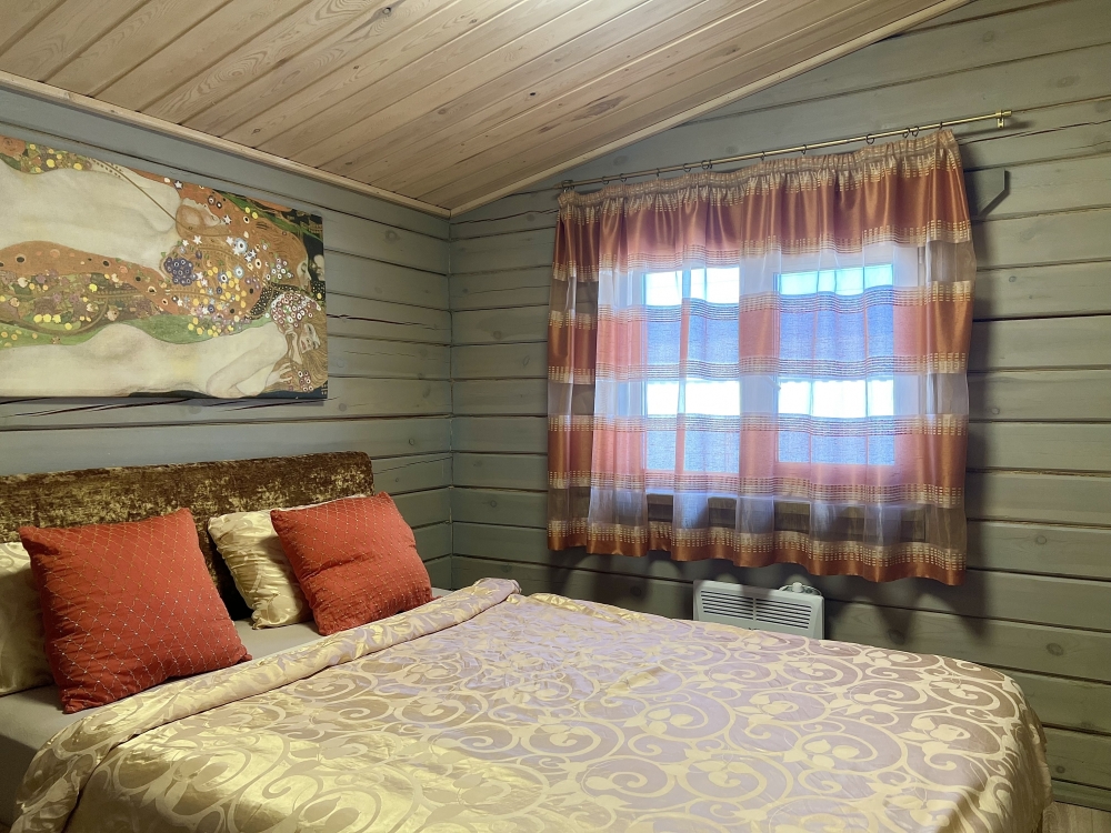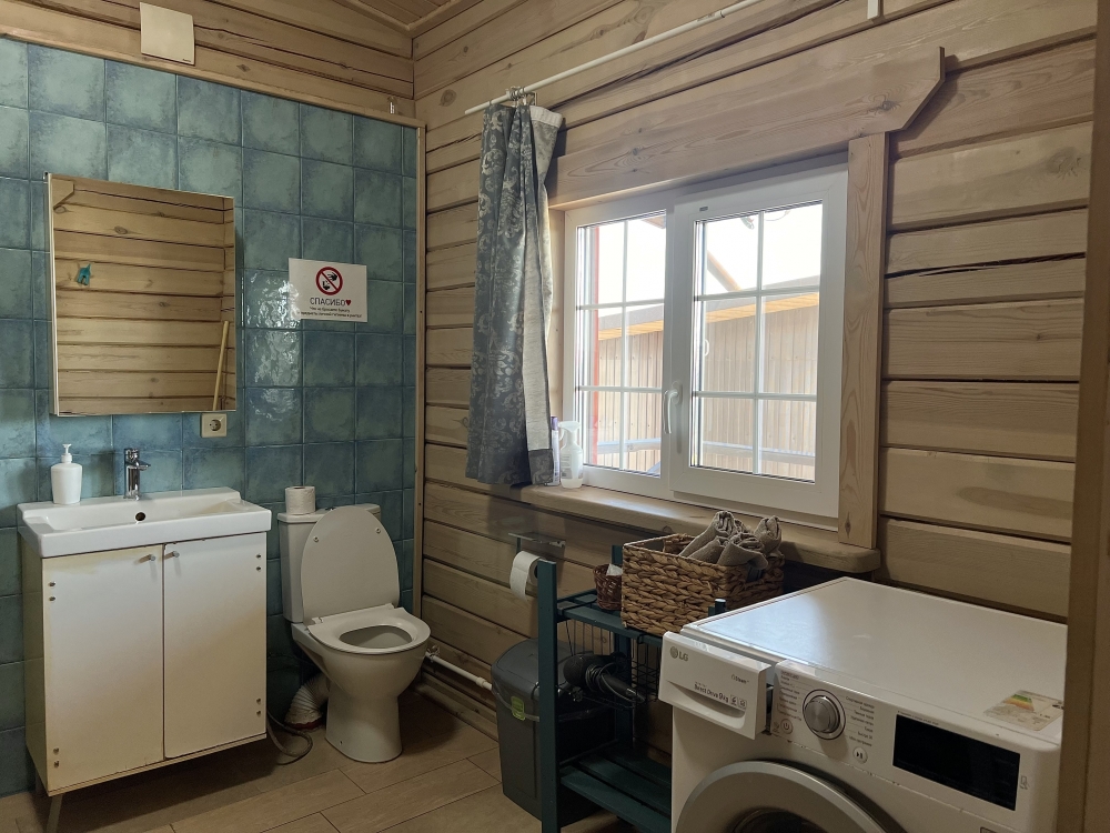 Светлый и просторный дом для отдыха на природе с террасой и качелью. Дом из натурального дерева, расположен на участке 6 соток, в нем есть всё необходимое для комфортного пребывания гостей. Дом полностью огорожен забором имеет свою парковку на несколько машин. В доме 2 отдельные спальни, большая кухня гостиная. Имеется вся необходимая посуда, чайник, микроволновая печь, индукционная плита, холодильник, телевизор, большой обеденный стол со скамьями, постельное белье, полотенца, чай, мыло, шампунь, тапочки, туалетные принадлежности.