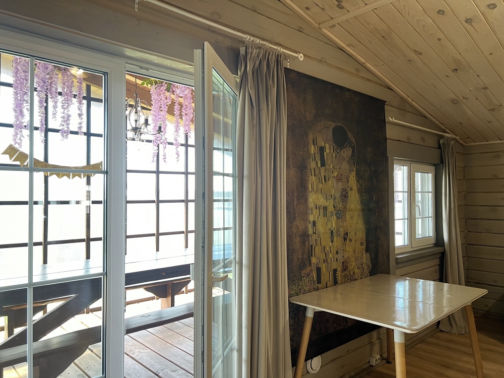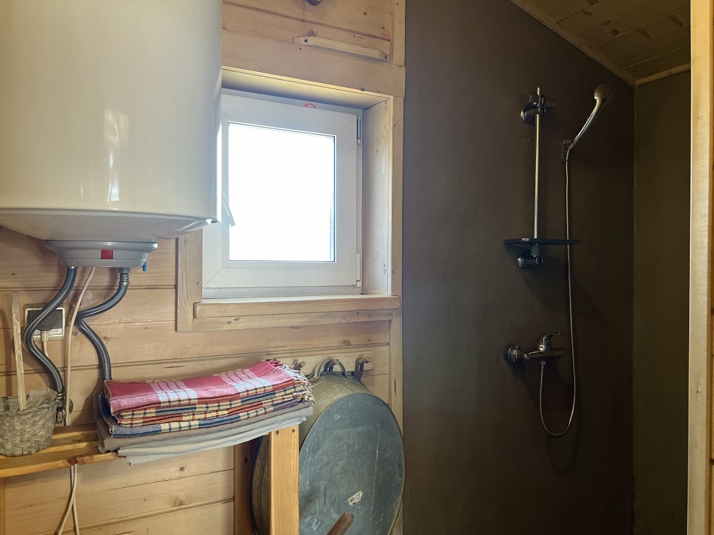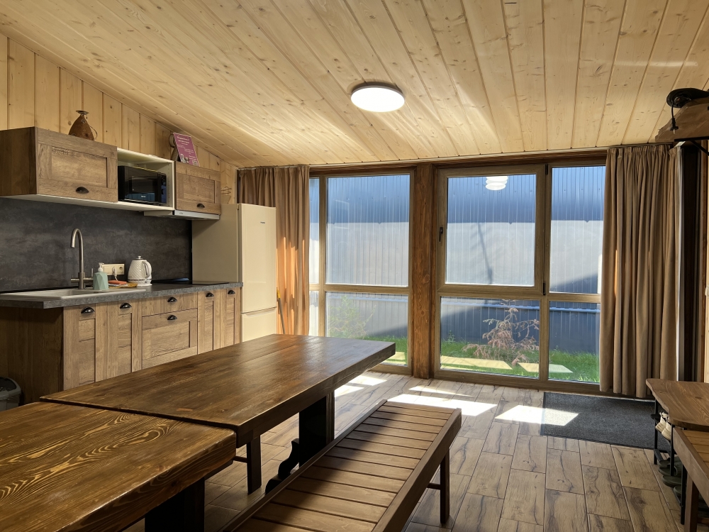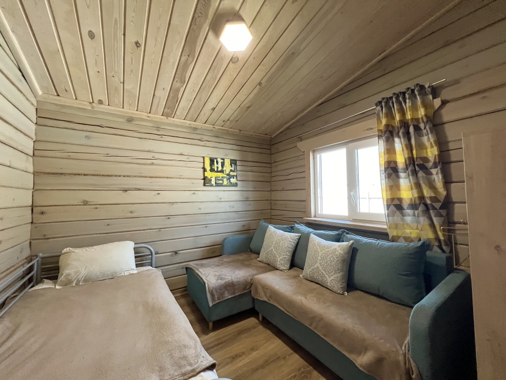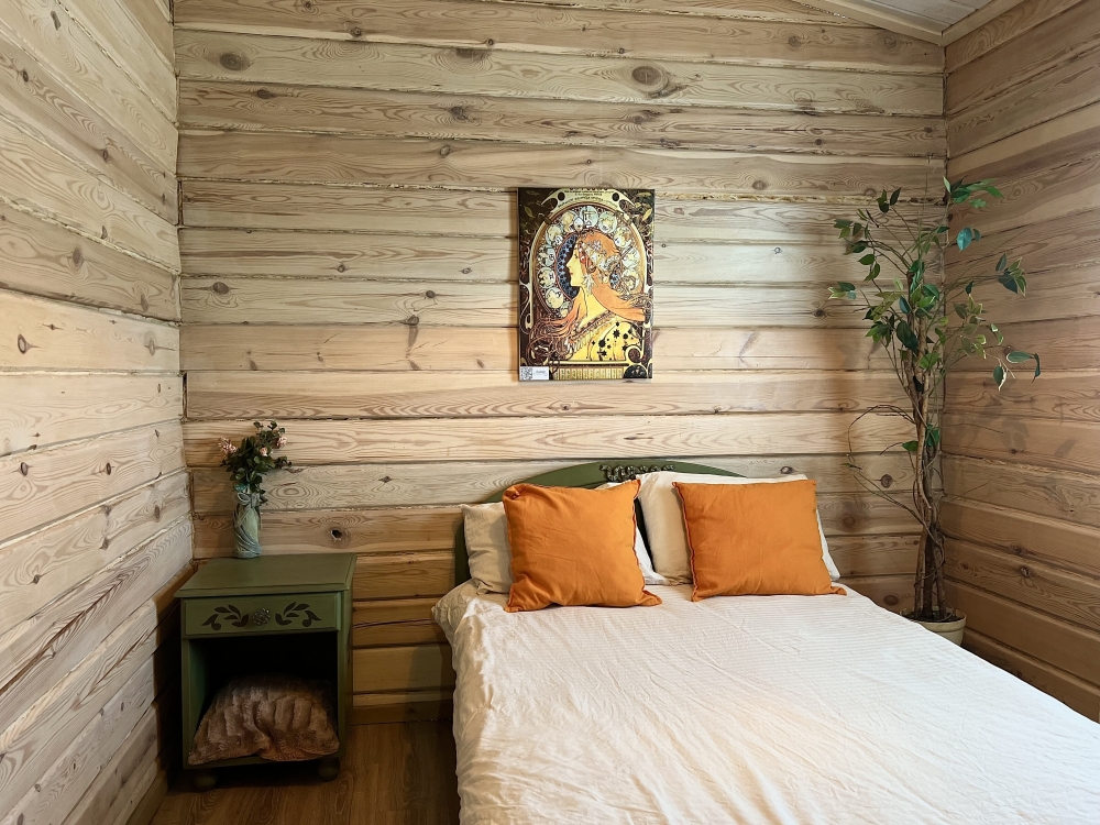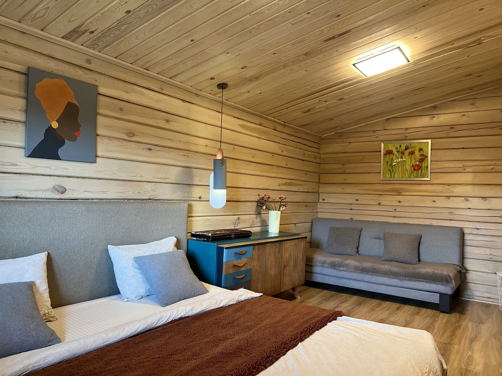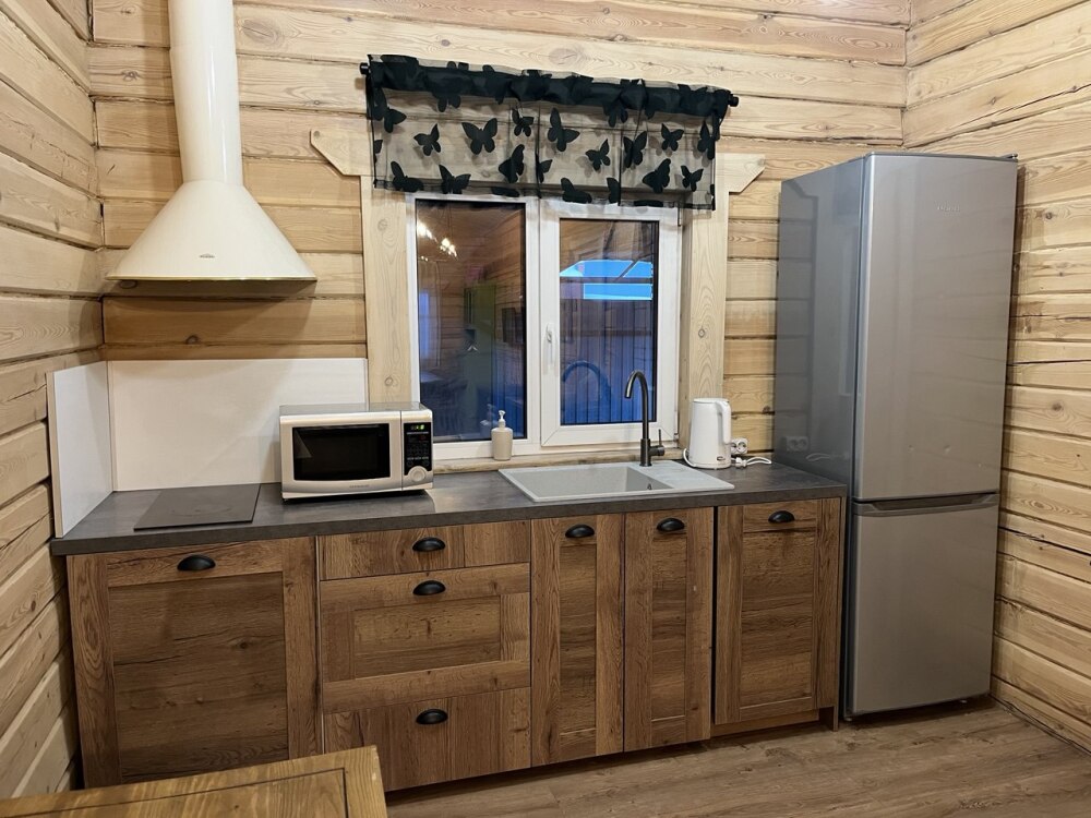 Светлый и просторный дом для отдыха на природе с террасой и качелью. Дом из натурального дерева, расположен на участке 6 соток, в нем есть всё необходимое для комфортного пребывания гостей. Дом полностью огорожен забором имеет свою парковку на несколько машин. В доме 2 отдельные спальни, большая кухня гостиная. Имеется вся необходимая посуда, чайник, микроволновая печь, индукционная плита, холодильник, телевизор, большой обеденный стол со скамьями, постельное белье, полотенца, чай, мыло, шампунь, тапочки, туалетные принадлежности.
