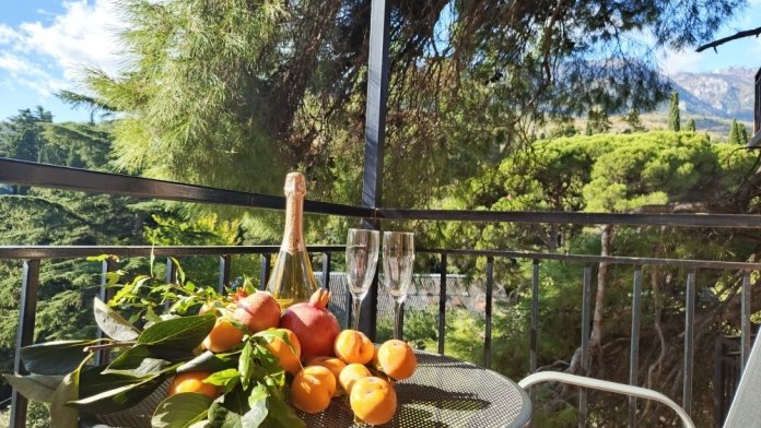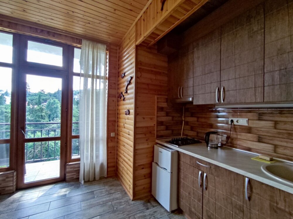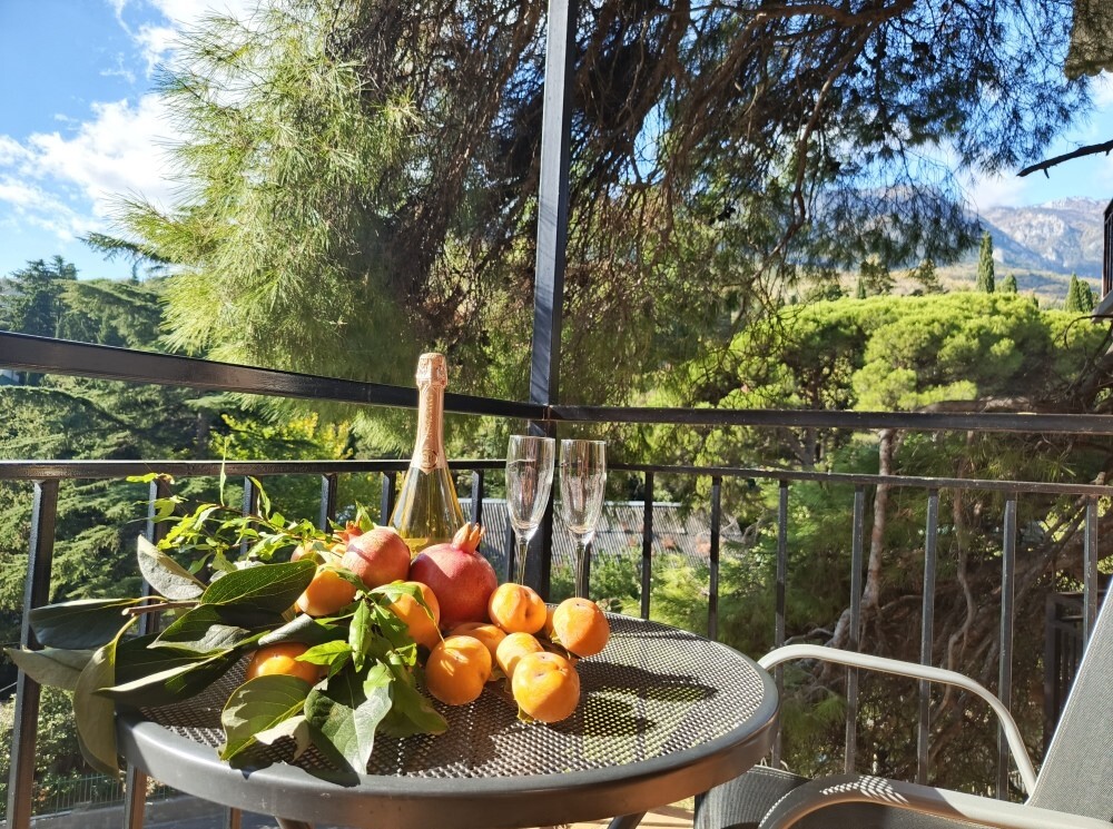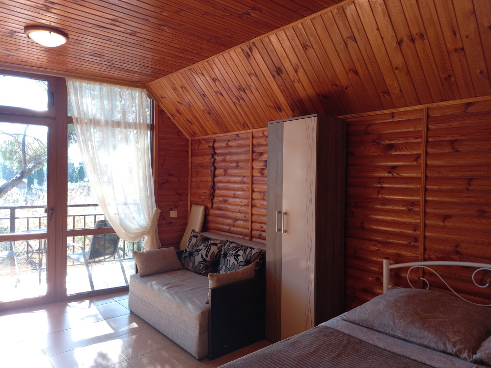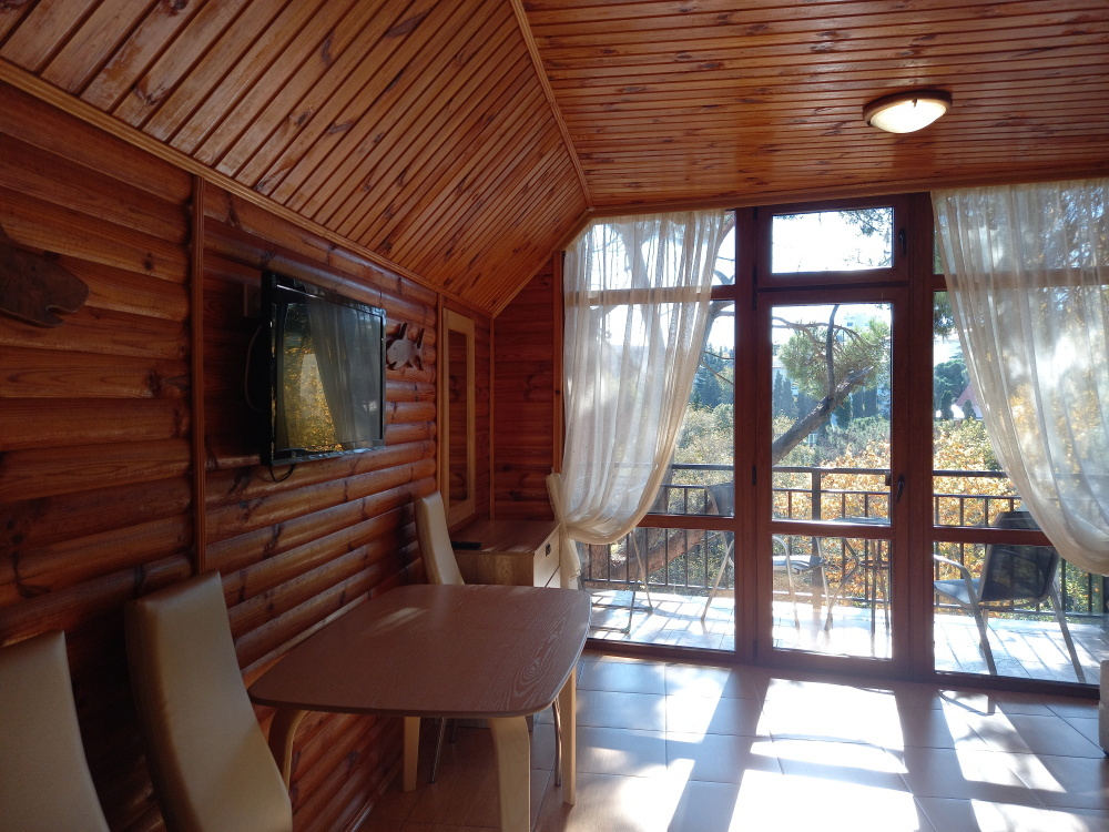 Вход в номер находится на 2 этаже, балкон со столиком и удобными креслами - на уровне 4 этажа, размер балкона 4*1,7 м, площадь номера 30м2. В номере: панорамные окна, вид на Гурзуф и крымские горы. Спальные места: двуспальная кровать и двуспальный диван, мебель и техника: шкаф, кондиционер, теплый пол, телевизор, кабельное телевидение, гладильная доска, утюг, фен, wi-fi, санузел, горячая и холодная вода постоянно, мини-кухня: 2 газовые конфорки, вытяжка, электрочайник, мойка, набор посуды, холодильник.