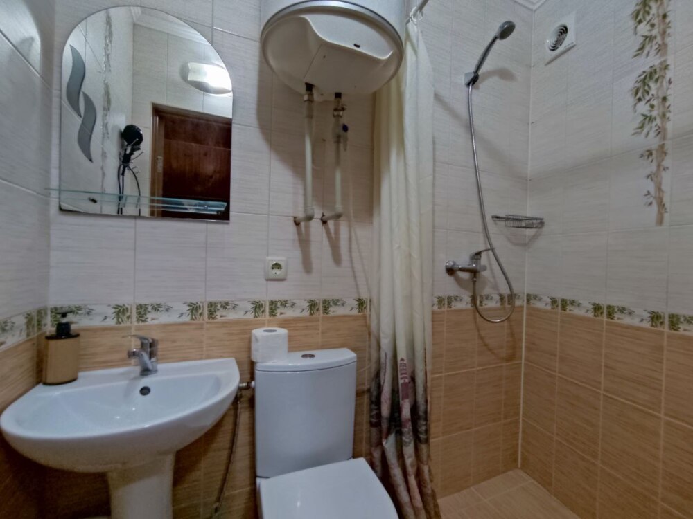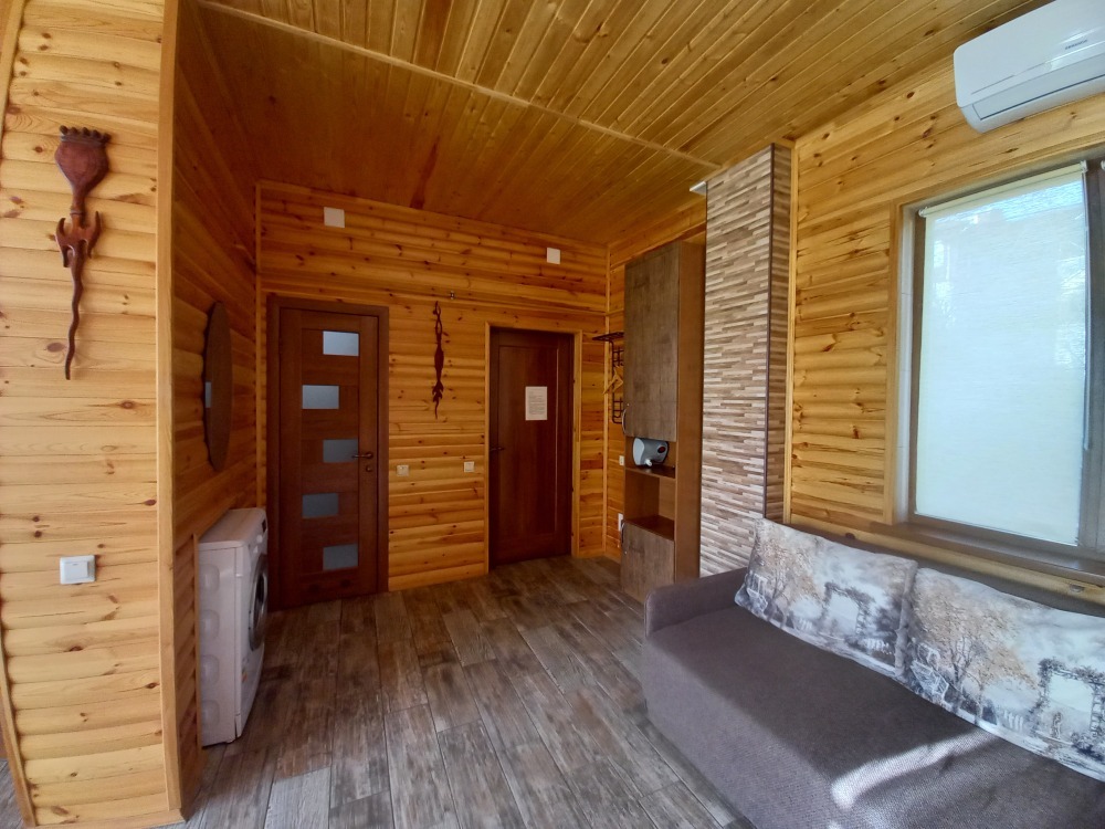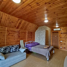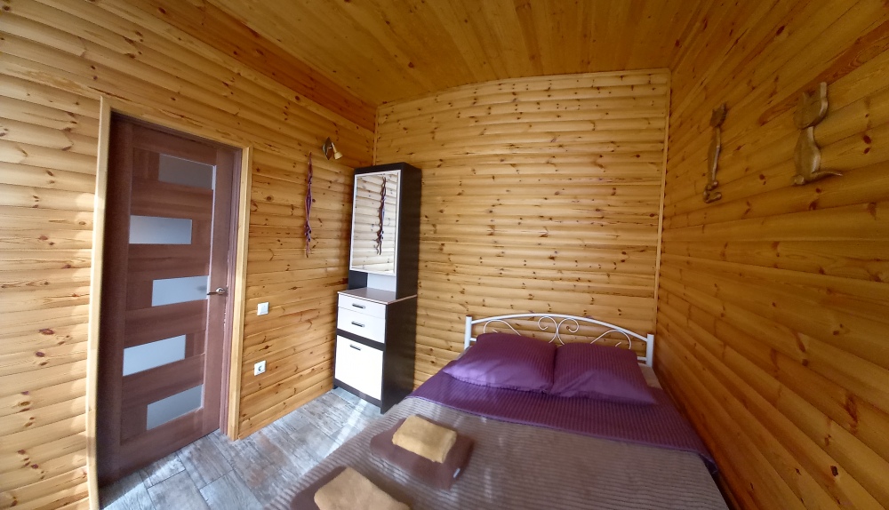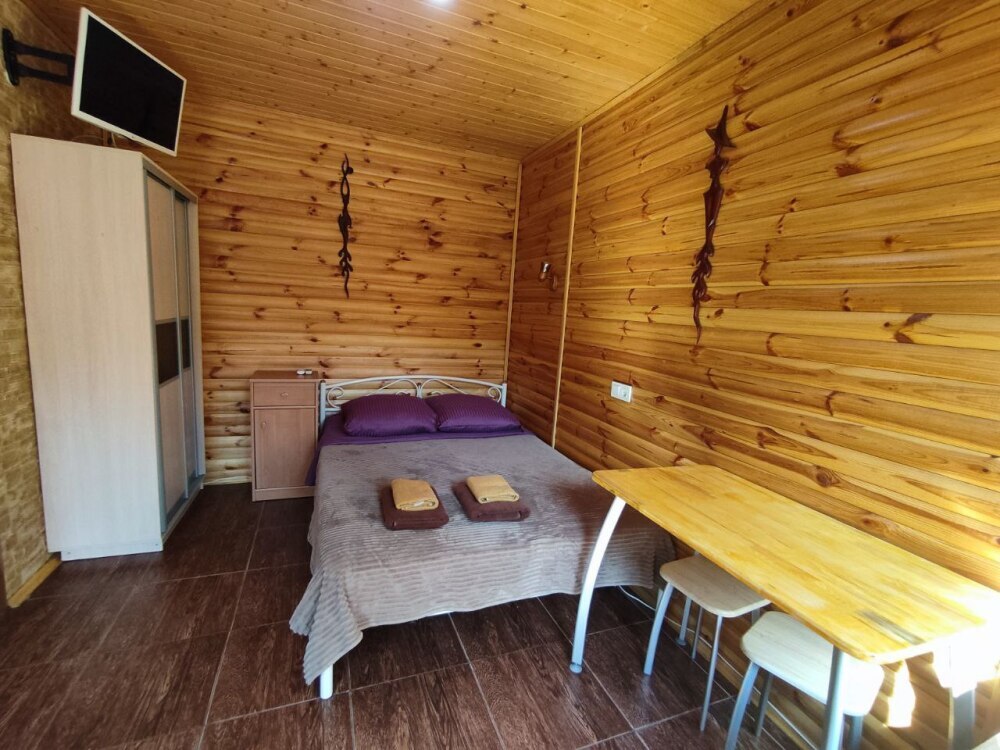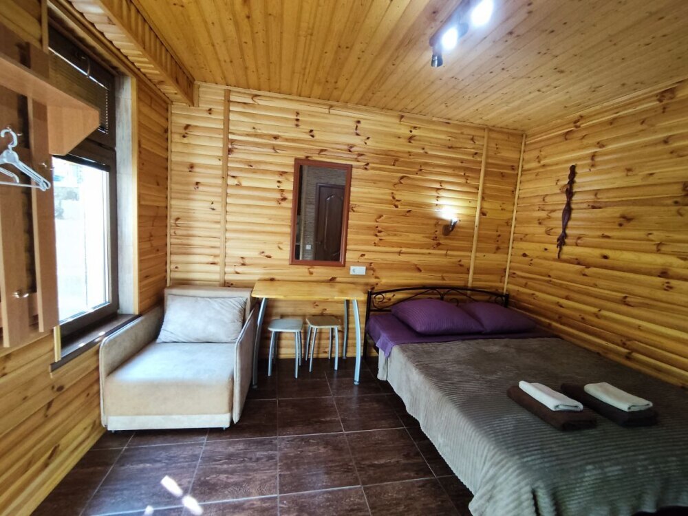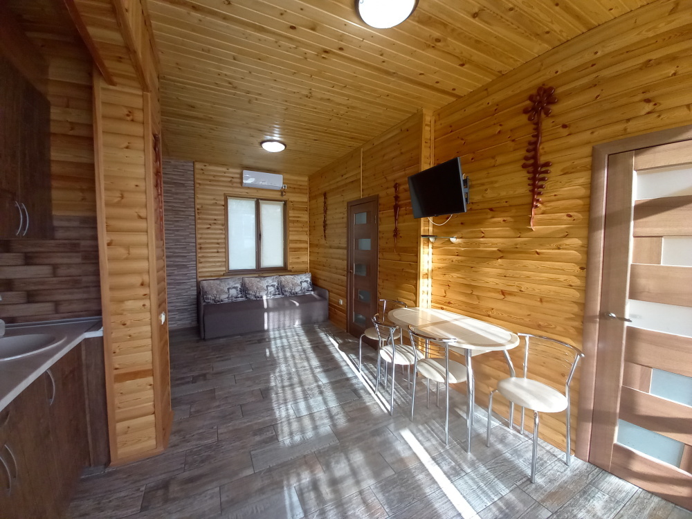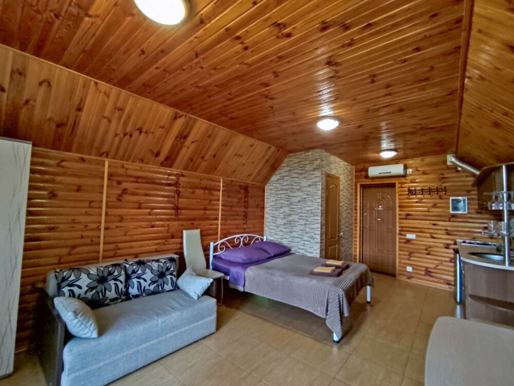 Есть дворик: столик и удобные кресла, сушилка для белья, которые относятся к данному номеру и их не занимают другие гости. В номере двуспальная кровать и кресло кровать, шкаф-купе, комод, кондиционер, теплый пол, телевизор, кабельное телевидение, санузел, фен, гладильная доска, утюг, мини-кухня: 2 конфорки, вытяжка, электрочайник, мойка для посуды, холодильник, посуда, WI-FI.