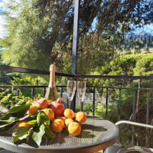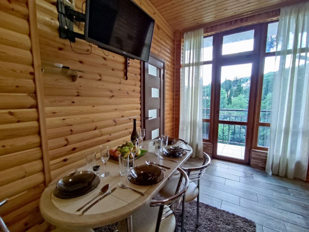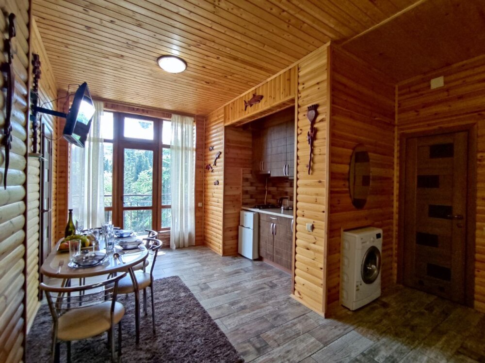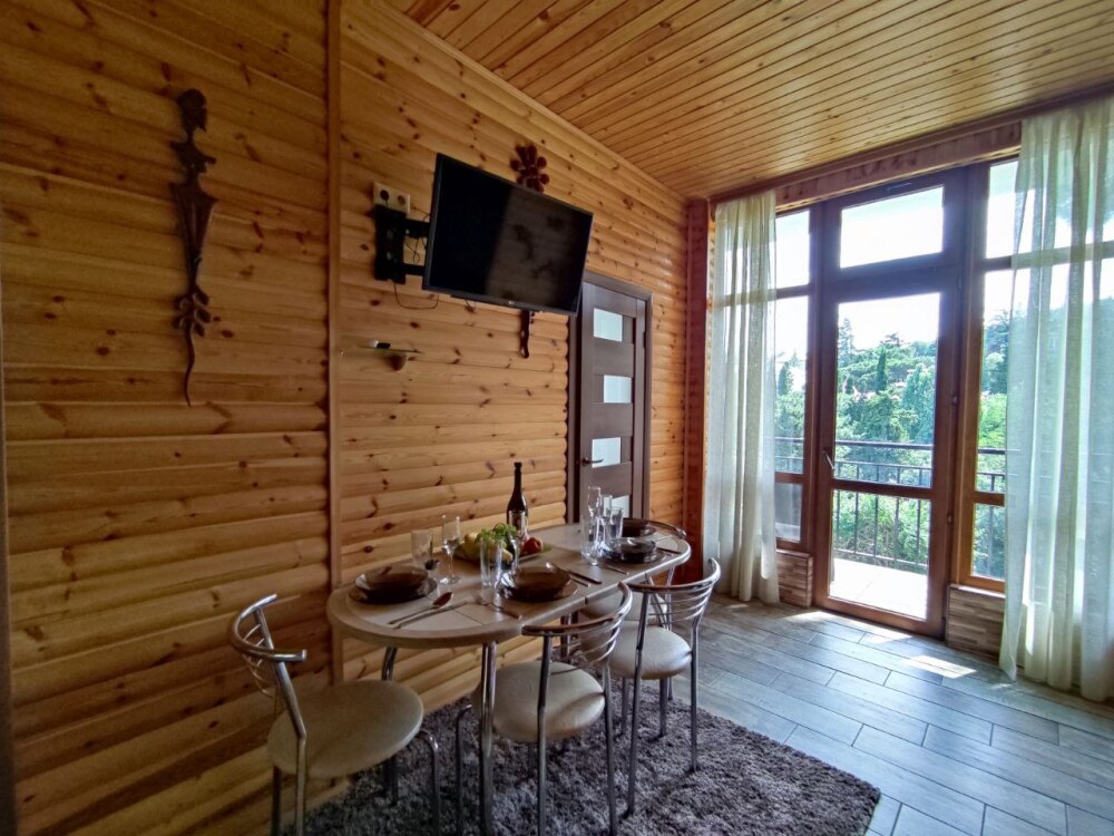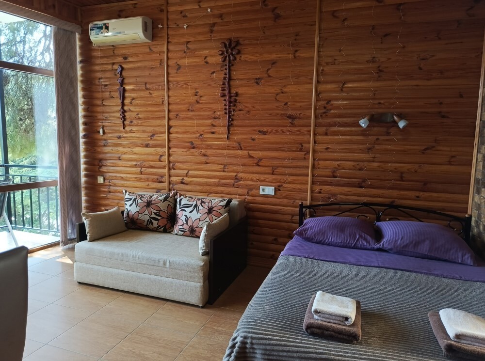 Есть дворик, в котором кресла и сушилка для белья, относящиеся именно к этому номеру. В номере двуспальная кровать и кресло кровать, вешалка, комод, кондиционер, теплый пол, телевизор, кабельное телевидение, фен, санузел, гладильная доска, утюг, мини-кухня: 2 конфорки, вытяжка, электрочайник, мойка для посуды, холодильник, посуда, WI-FI.