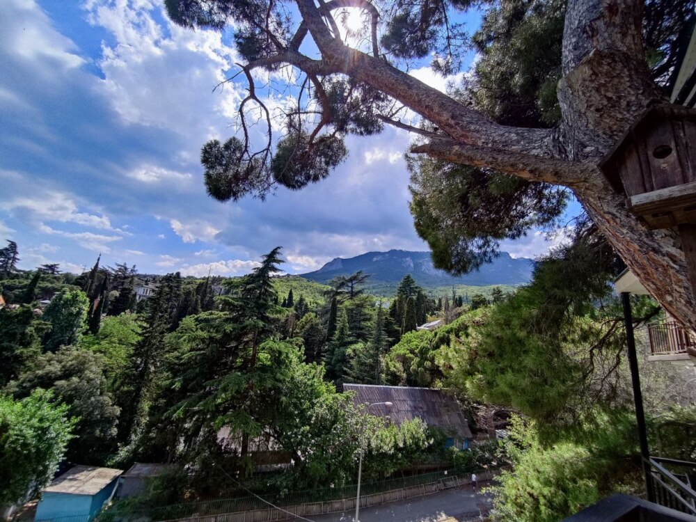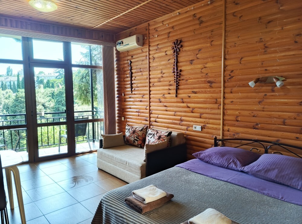 Вход в номер находится на 3 этаже по винтовой лестнице, но подъем компенсируется прекрасным видом на море и горы, панорамные окна дадут возможность насладиться красотой южного берега Крыма, балкон с удобными креслами и столиком - на уровне 5 этажа, его размеры - 4*1,8 м. Спальные места: двуспальная кровать и двуспальный диван, мебель и техника: вешалка, шкаф, комод, кондиционер, теплый пол, телевизор, кабельное телевидение, санузел, гладильная доска, утюг, фен, мини-кухня: 2 газовые конфорки, вытяжка, электрочайник, мойка, холодильник, набор посуды, WI-FI.