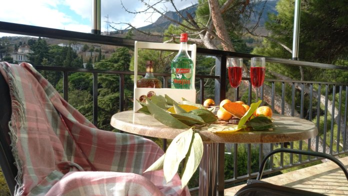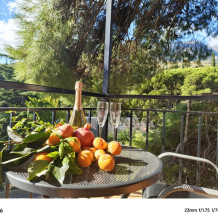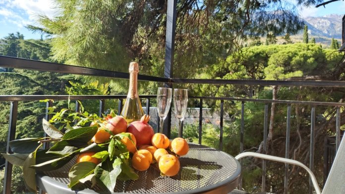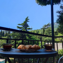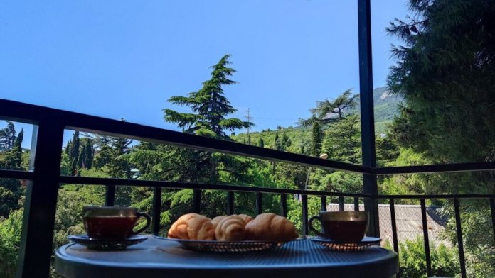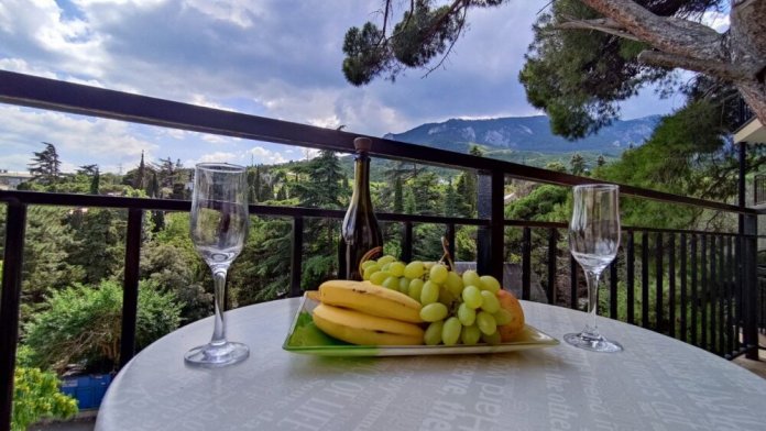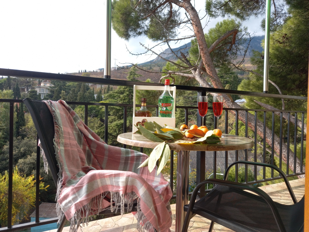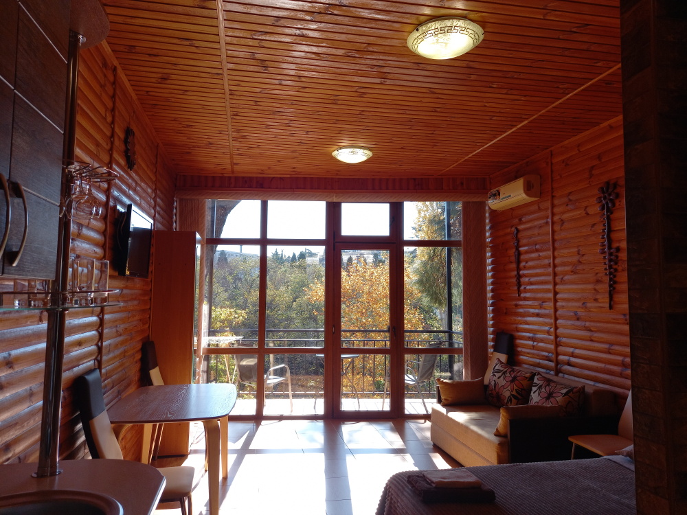 Вход в номер находится на втором этаже, балкон со столиком и удобными креслами — на уровне четвертого этажа, размер балкона 4*1,7 м, площадь номера 30кв м. В номере панорамные окна, вид на Гурзуф и крымские горы. Спальные места: двуспальная кровать и двуспальный диван, мебель и техника: шкаф, кондиционер, теплый пол, телевизор, кабельное телевидение , гладильная доска, утюг, фен, wi-fi, сан узел, горячая и холодная вода постоянно, мини-кухня: две газовые конфорки, вытяжка, электрочайник, мойка, набор посуды, холодильник.