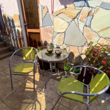 Два двухместных номера (1а,1б) без балкона (возможно бесплатное дополнительное место для ребенка), номера площадью 17 кв. м, для сна двуспальная кровать + кресло кровать, также у номеров на улице свой столик, кресла и сушилка для белья.