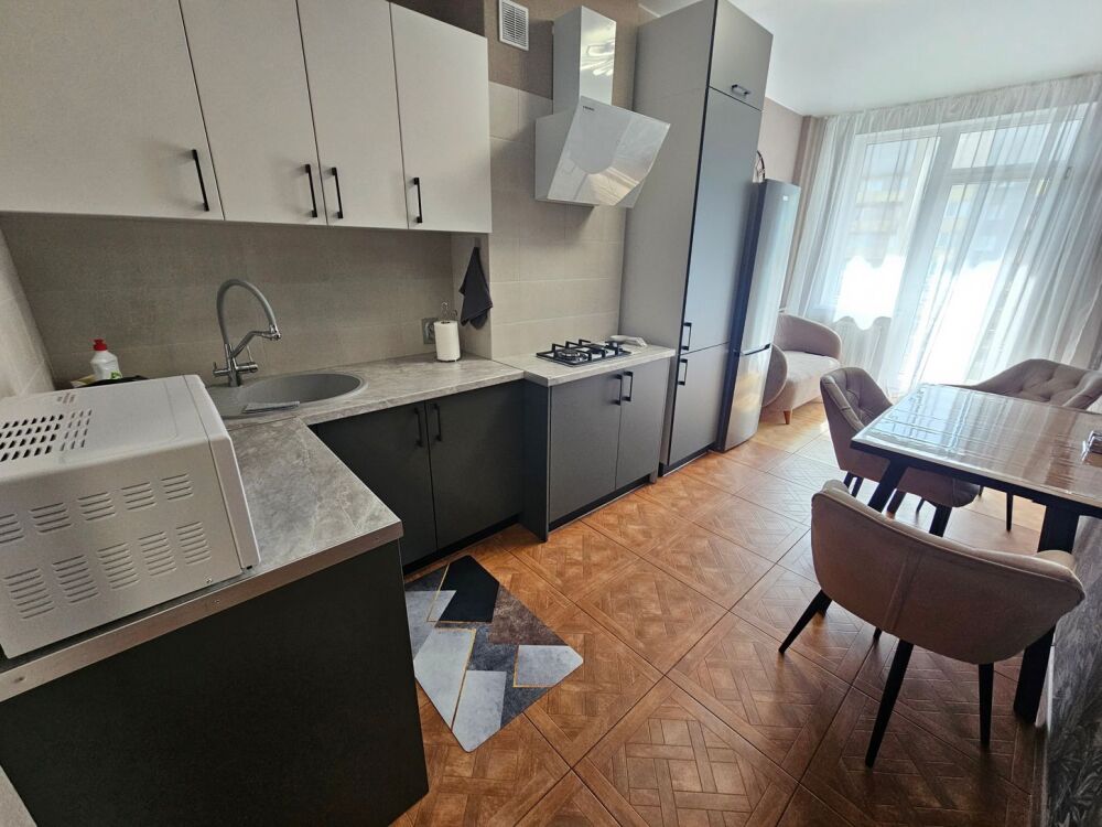 Апартаменты с современным интерьером расположены в спокойном районе недалеко от центра города. Квартира подойдёт для комфортного проживания и отдыха после прогулок и деловых поездок.