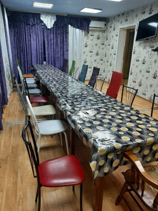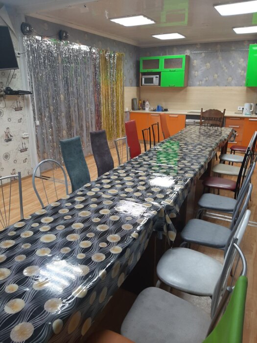 В доме 6 комнат. На первом этаже находятся кухня со всем необходимым чайник, 2 холодильника, электропечь с духовкой, кухонный гарнитур (пара кастрюль, две сковороды, ножи, ложки) , микроволновка, мультиварка, телевизор. Единственное нужно приобрести одноразовую посуду.