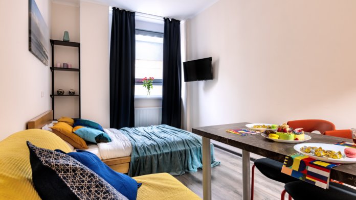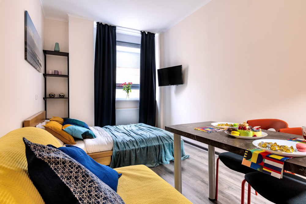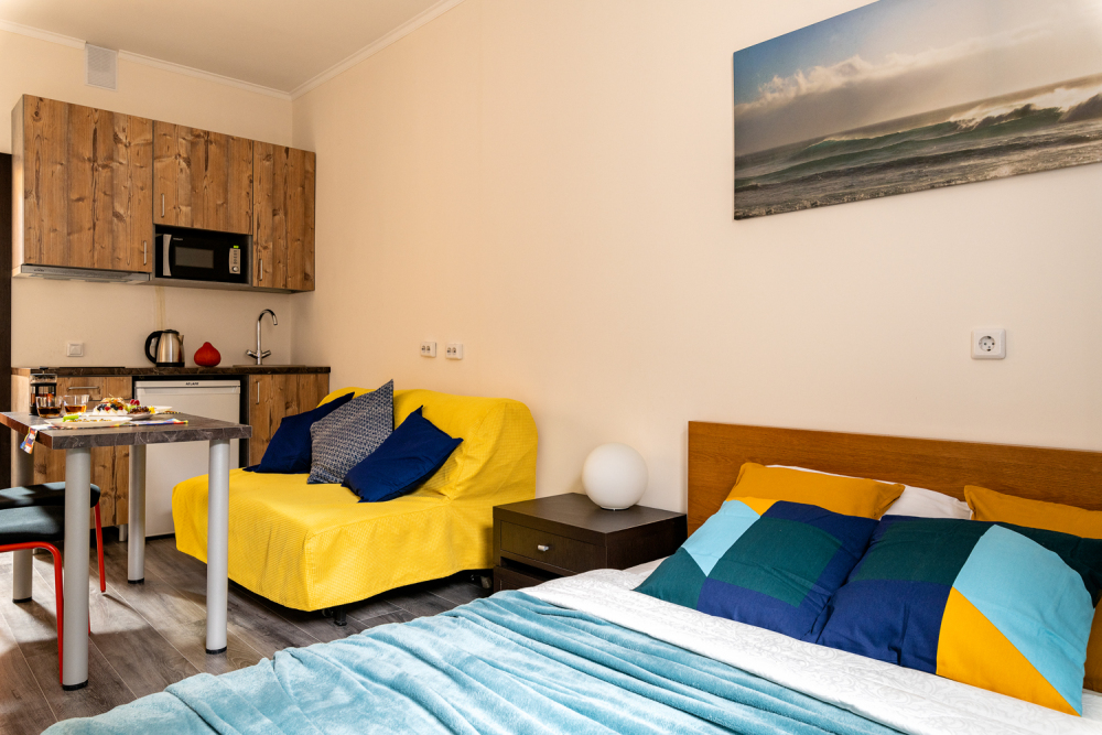 В квартире есть все необходимое для комфортного проживания: двуспальная кровать, раскладной диван, телевизор, кухонная зона со всем необходимым, совмещенный санузел.