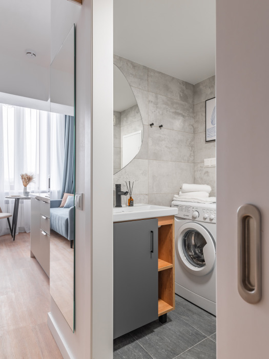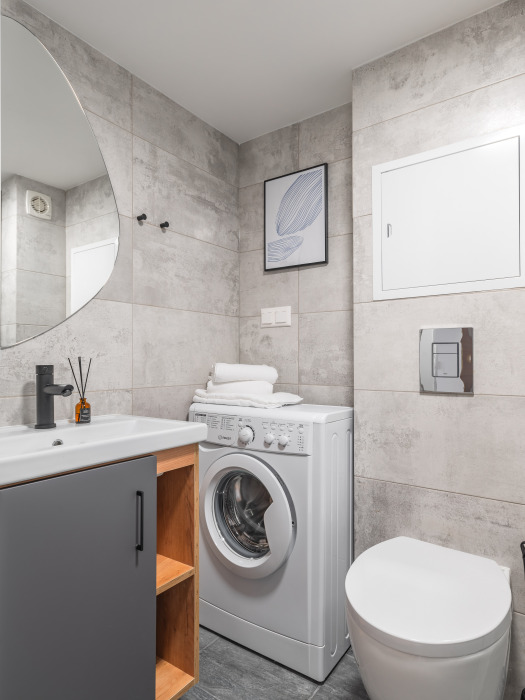В квартире есть все необходимое для комфортного проживания: двуспальная кровать, раскладное кресло, телевизор, кухонная зона со всем необходимым, совмещенный санузел с ванной.