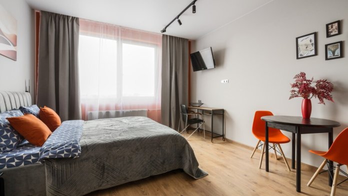 Двухспальная кровать 160х200 с ортопедическим матрасом, прикроватные тумбы. Современный ЖК-телевизор со SmаtrТV для просмотра любимых программ и фильмов, застекленный балкон.