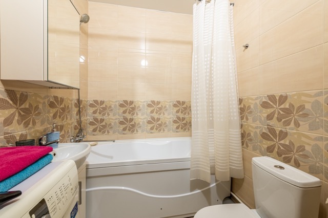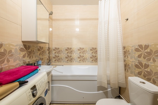 В квартире есть балкон и все необходимое для комфортного проживания: двуспальная кровать, раскладной диван, телевизор, кухонная зона со всем необходимым, совмещенный санузел.