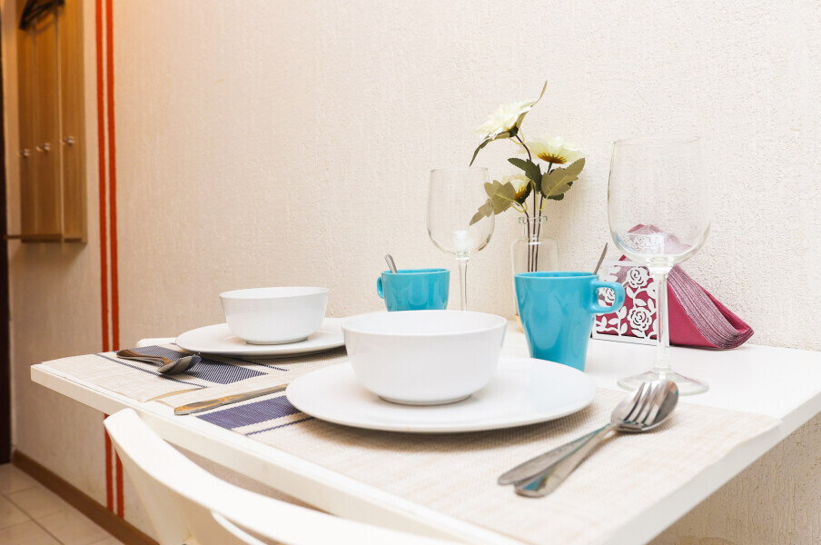 - Кухня с холодильником, плитой, микроволновкой, чайником и посудой.