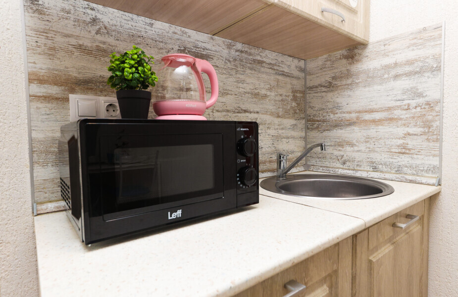 - Кухня с холодильником, плитой, микроволновкой, чайником и посудой.