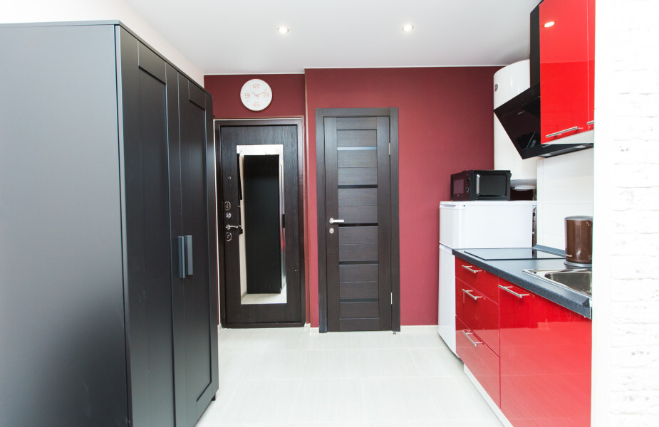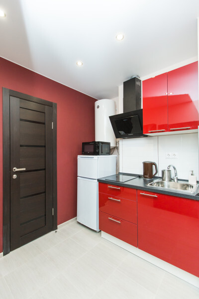 - Кухня с холодильником, плитой, микроволновкой, чайником и посудой.