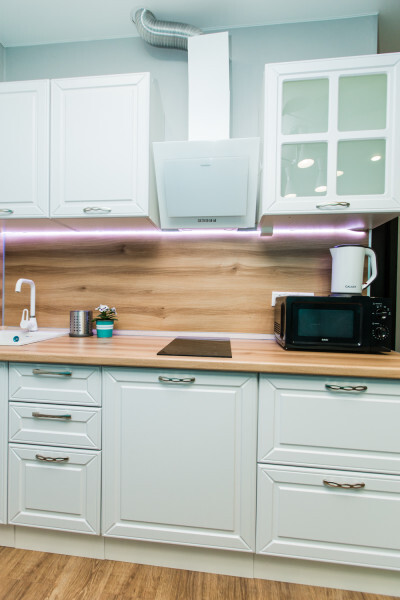 - Кухня с холодильником, плитой, микроволновкой, чайником и посудой.