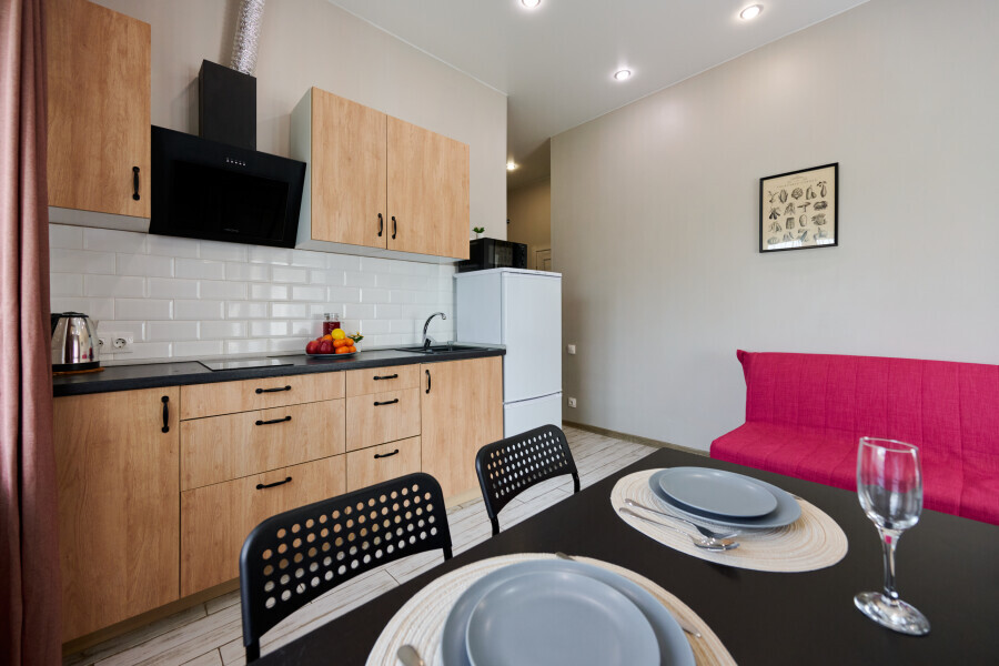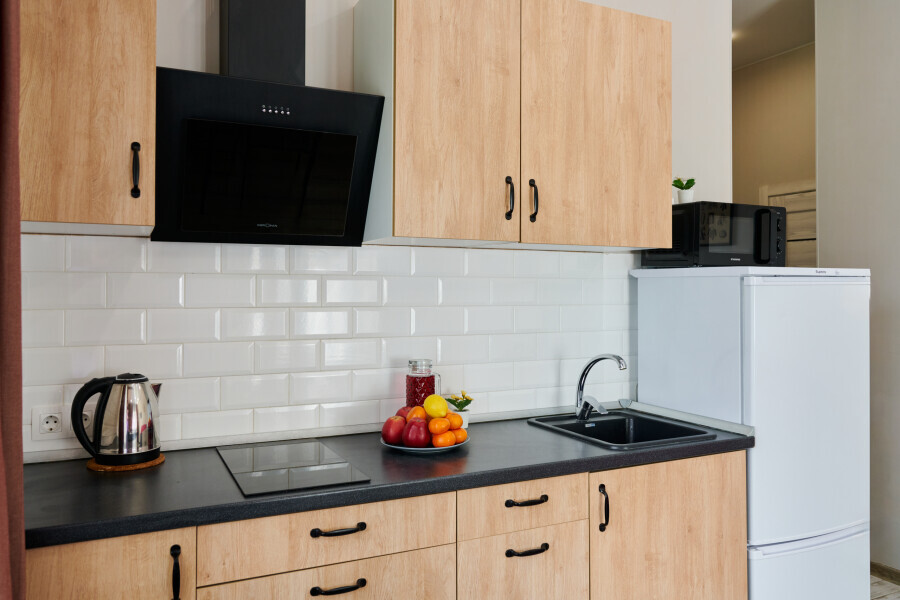 - Кухня с холодильником, плитой, микроволновкой, чайником и посудой.