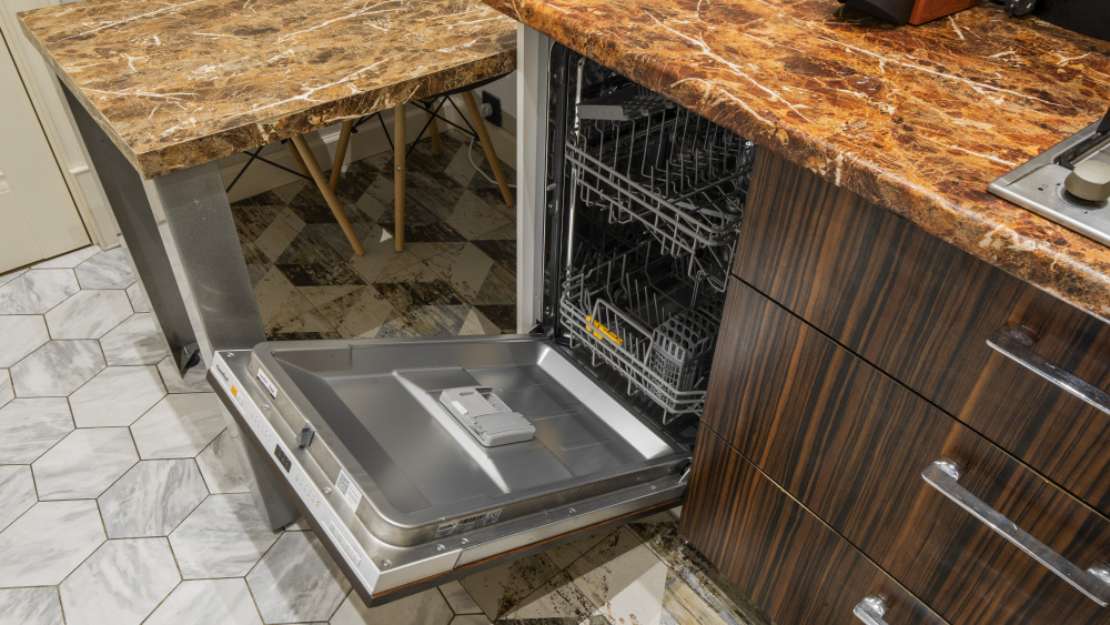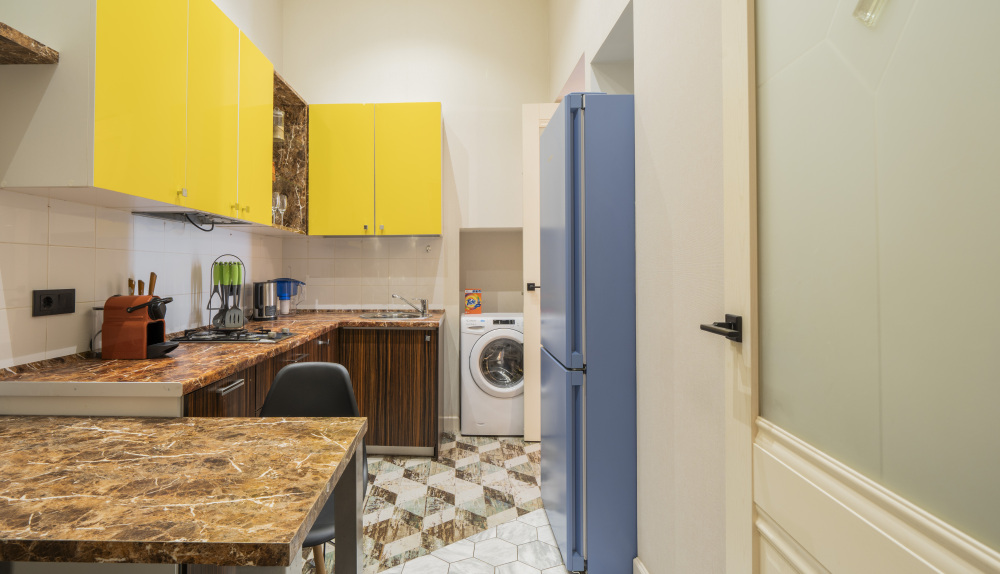 посудомоечная и стиральная машины, плита, холодильник, чайник, посуда, чай ️