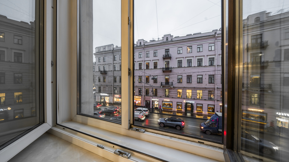 Из окон открывается панорамный вид на Невский и архитектуру исторического центра. Благодаря двойным стеклопакетам в квартире тихо и спокойно, несмотря на центральную локацию.