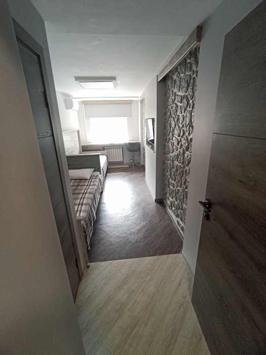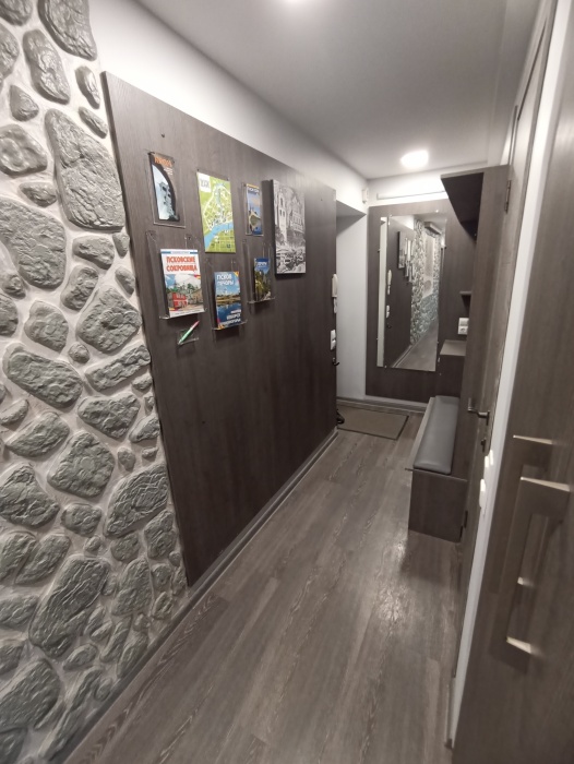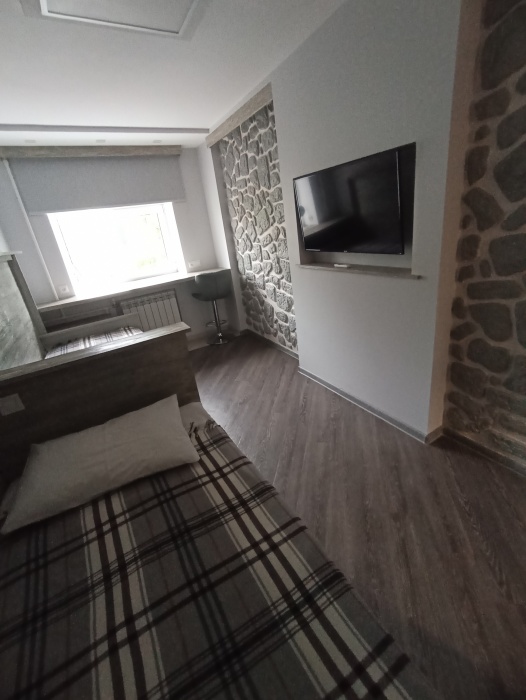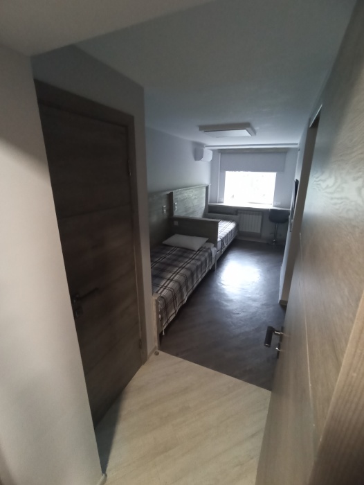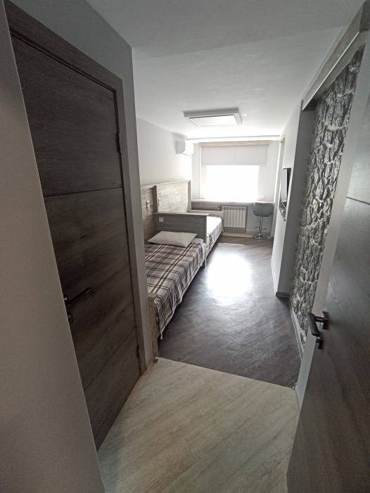 В кваpтире авторский ремонт. Две раздельные комнаты. В одной двуспальная кровать, в другой две односпальные кровати.