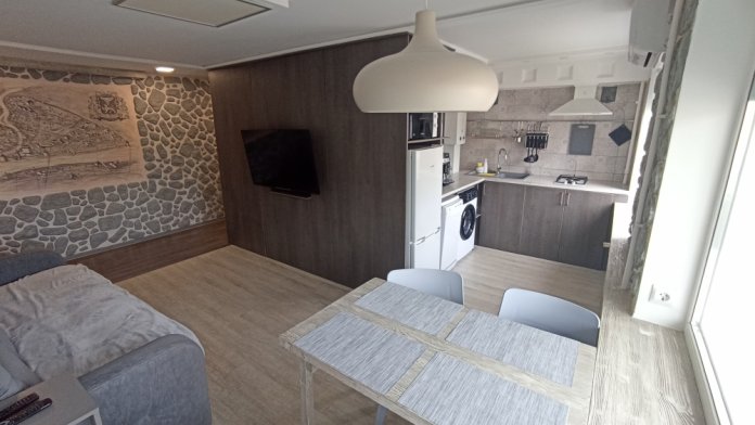 В кухне гостиной расположен большой диван, на котором с комфортом разместятся 2 человека.