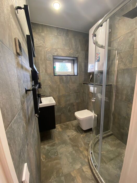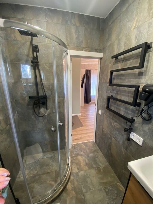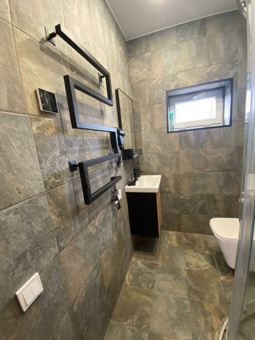 - Ванная комната оборудована: душ, раковина, унитаз, полотенцесушитель, фен.