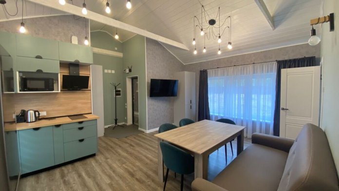 - Кухня: кухонный гарнитур, обеденная группа, варочная панель, микроволновая печь, посудомойка, холодильник, чайник, столовые приборы, вся необходимая посуда.