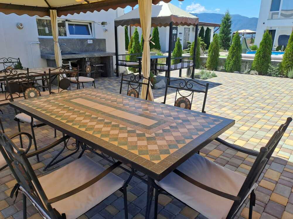 Мангал. Лежаки, столики и зонты у бассейна.