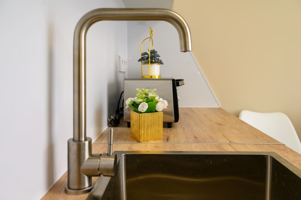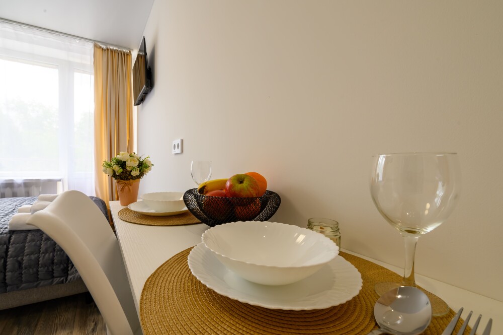 - Кухня с холодильником, плитой, микроволновкой, чайником и посудой