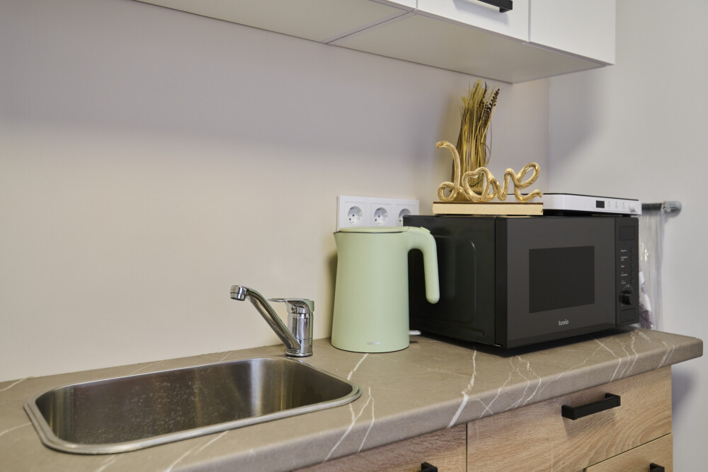 - Кухня с холодильником, плитой, микроволновкой, чайником и посудой.