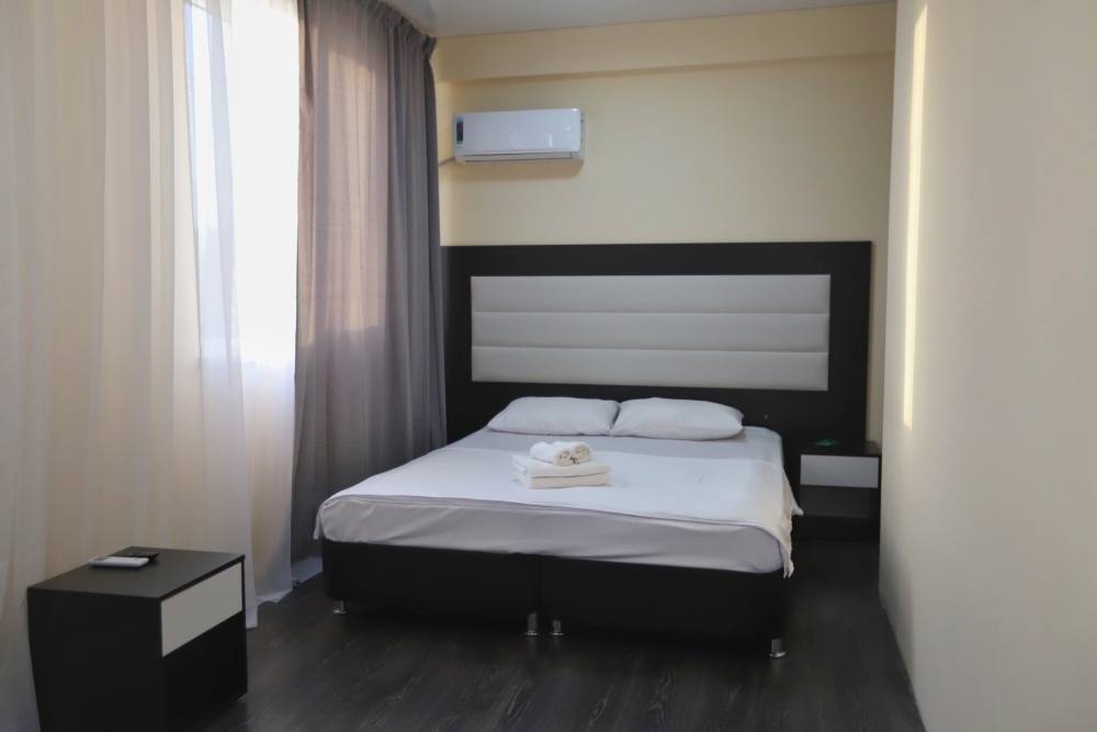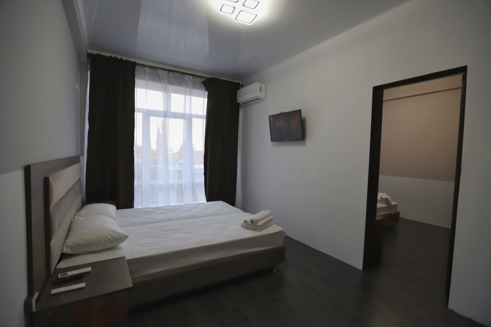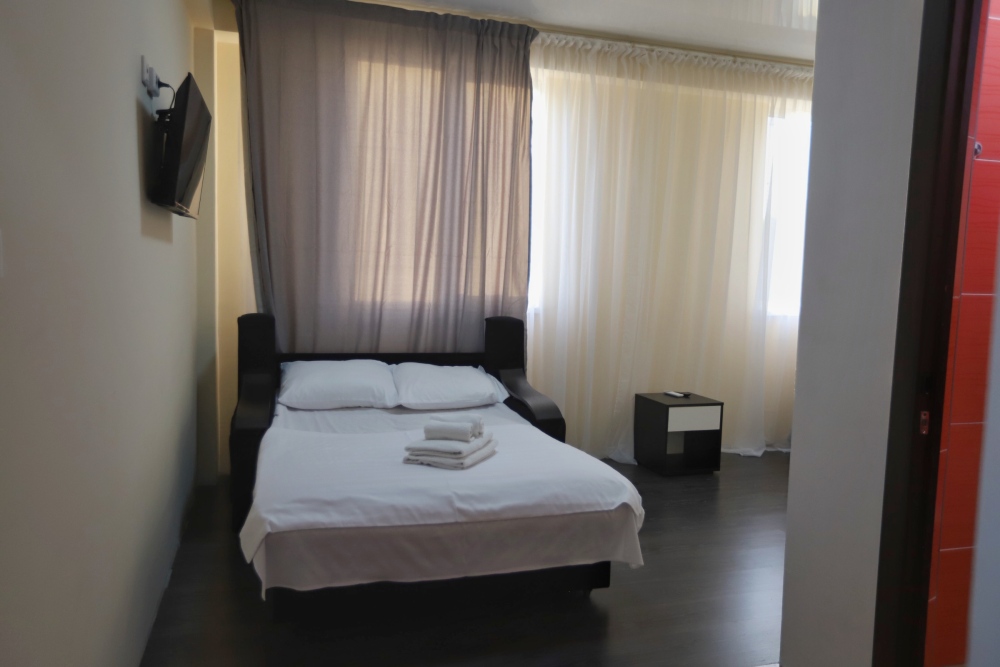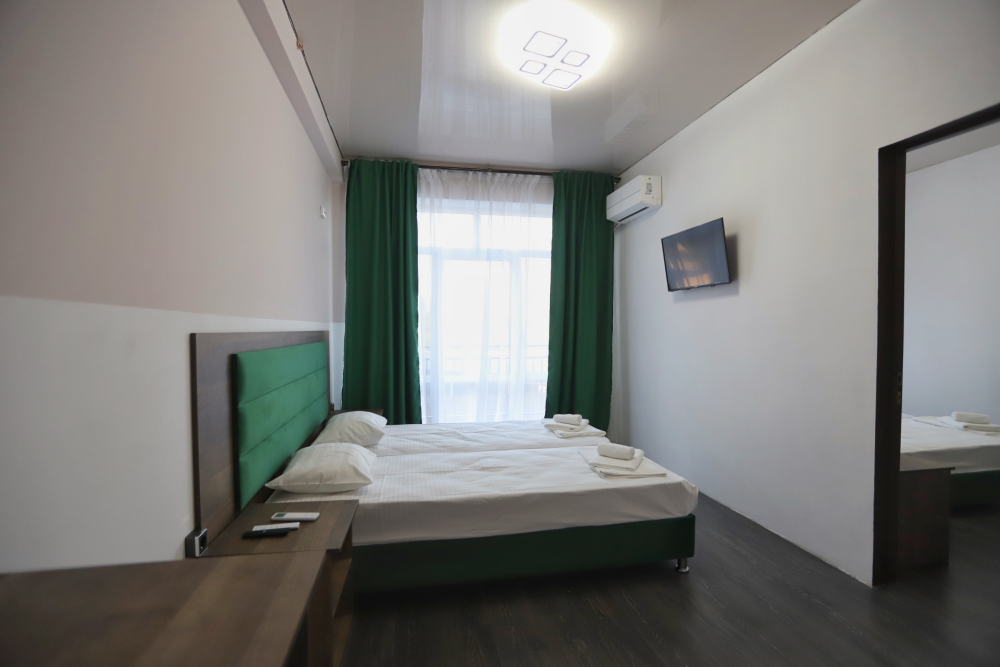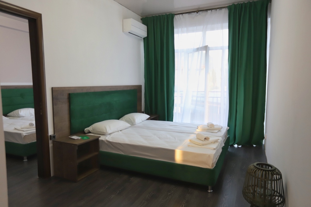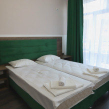Большой однокомнатный номер рассчитан на размещение четырёх человек на двух основных и одном дополнительном месте (диван-кровать). Номер отвечает всем современным требованиям комфорта и отдыха, оборудован индивидуальной системой климат контроля, кроватью с ортопедическим матрасом и мягким изголовьем с возможностью разделения на две кровати, выходом в интернет, телевизором с плоским экраном и спутниковым TV, звуконепроницаемыми окнами.
