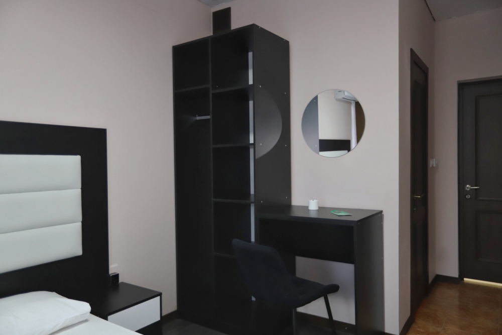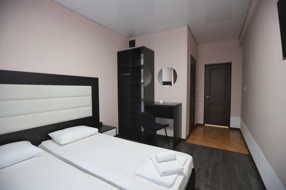 Номер отвечает всем современным требованиям комфорта и отдыха, кровать с ортопедическим матрасом и мягким изголовьем с возможностью разделения на две кровати, рабочим местом, выходом в интернет, телевизором с плоским экраном и спутниковым TV, звуконепроницаемыми окнами.