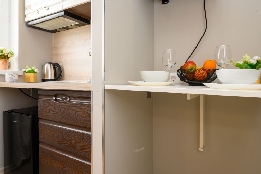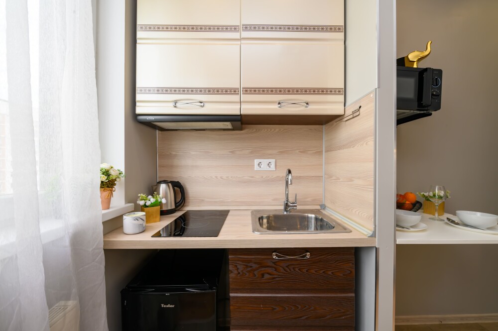 - Кухня с холодильником, плитой, микроволновкой, чайником и посудой.