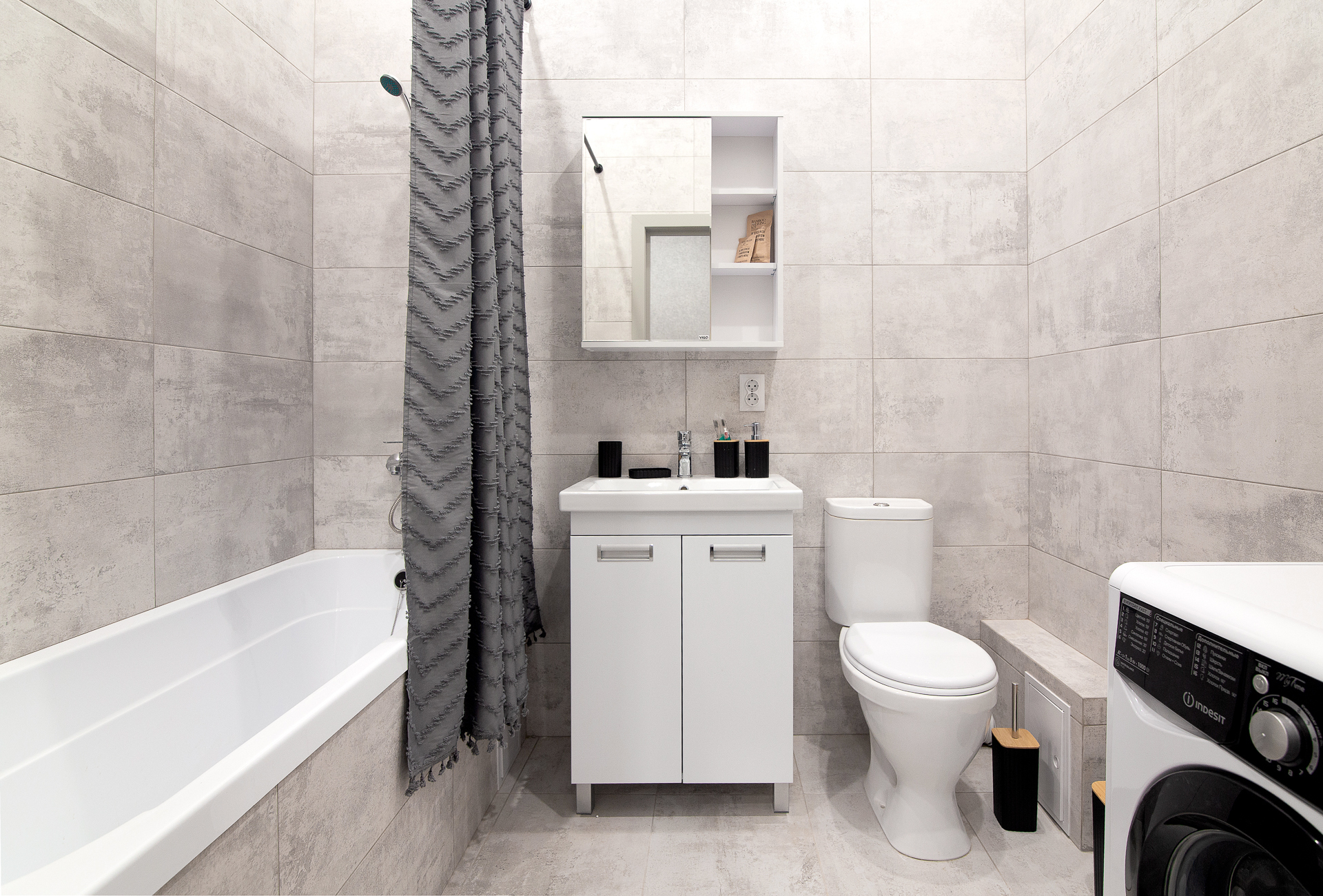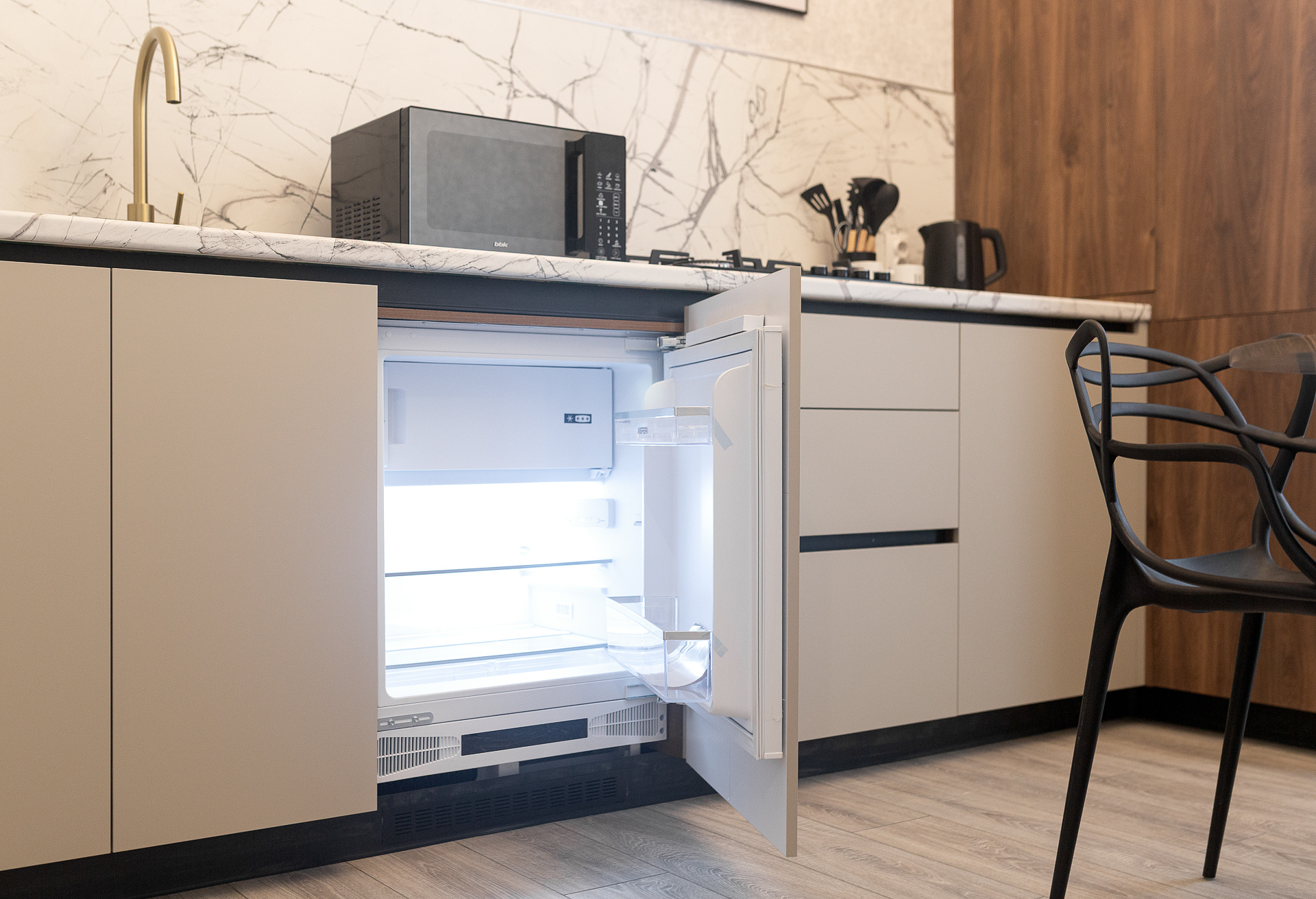 Стиральная машина, микроволновая печь, утюг, чайник, ТВ + Wi-Fi, холодильник.