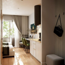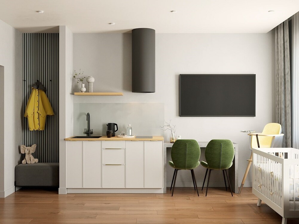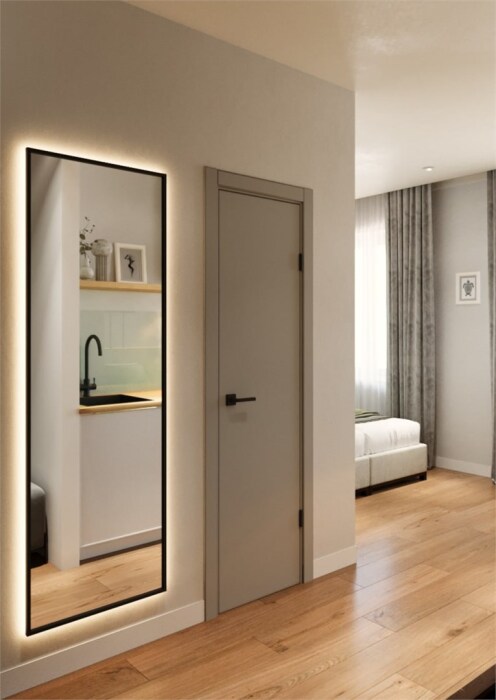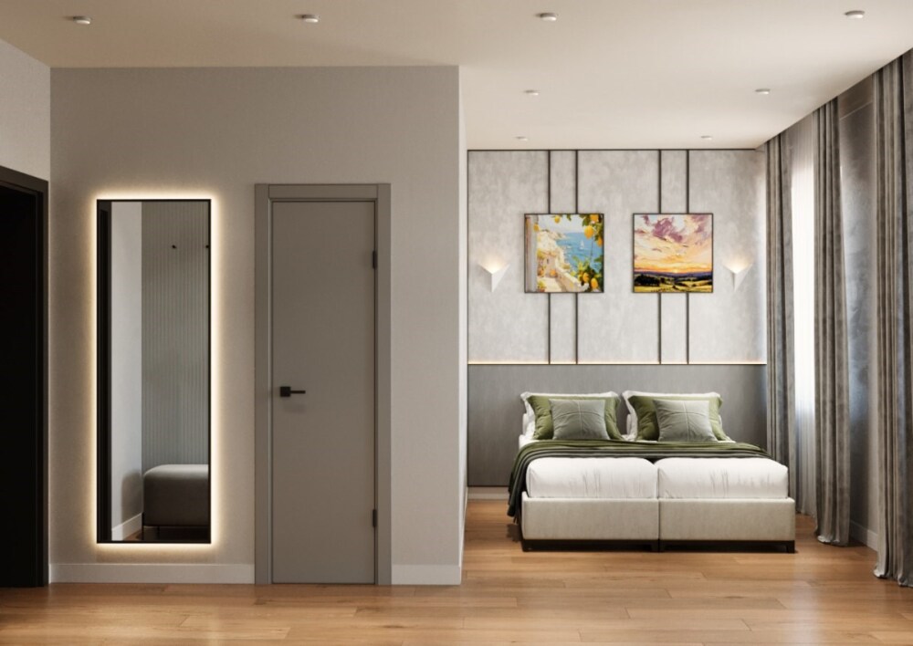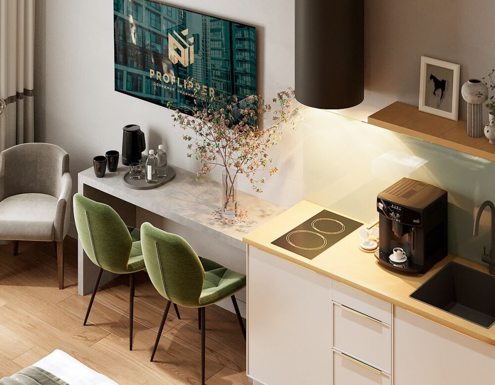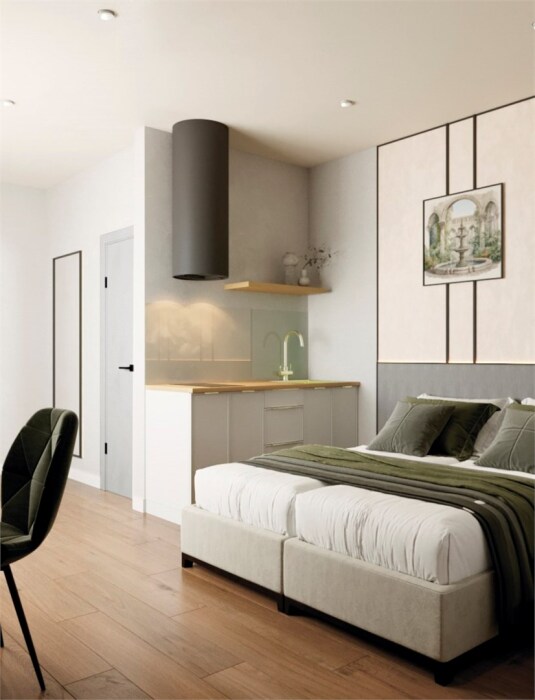 В номере одна большая двуспальная кровать (160*200 см) или две односпальные кровати (80*200 см), есть все необходимые для комфортного проживания – телевизор с плоским экраном, Wi-Fi, мини-кухня с индукционной плитой, вытяжкой и набором посуды, чайный островок, мини-холодильник, сейф, кондиционер, санузел с душевой, фен, водонагреватель, косметические средства, тапочки, набор полотенец для каждого гостя, махровые халаты, электронные замки, зеркало с подсветкой в полный рост. Есть отдельная рабочая зона.