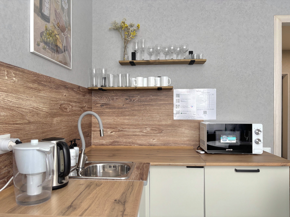 – Полностью оборудованная кухня (холодильник, индукционная варочная панель, духовой шкаф, посудомоечная машина, микроволновая печь, электрический чайник, фильтр для питьевой воды)