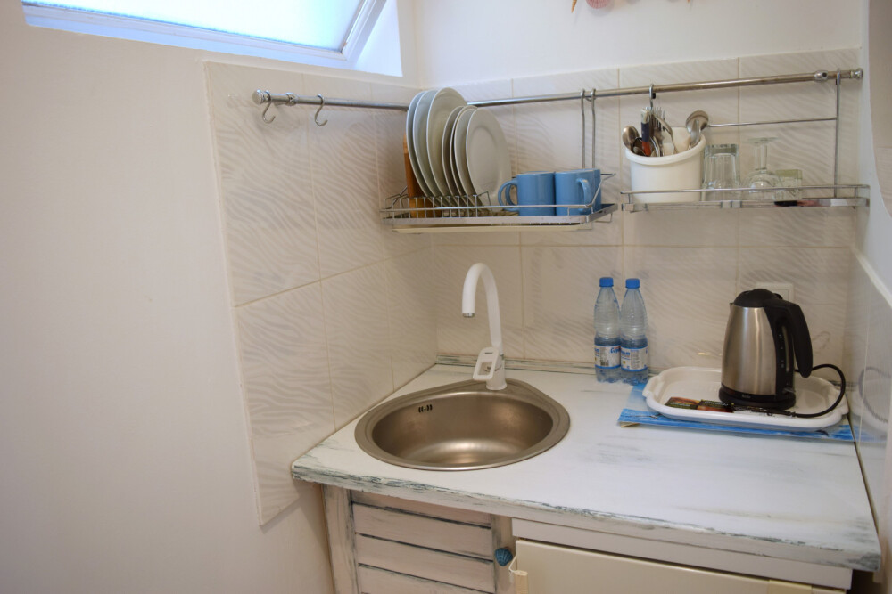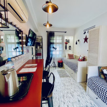Уютный, комфортный номер с отдельным входом, террасой или балконом; оформлен винтажными, авторскими работами, мини-кухня (мойка, электрический чайник, посуда, холодильник, микроволновая печь).