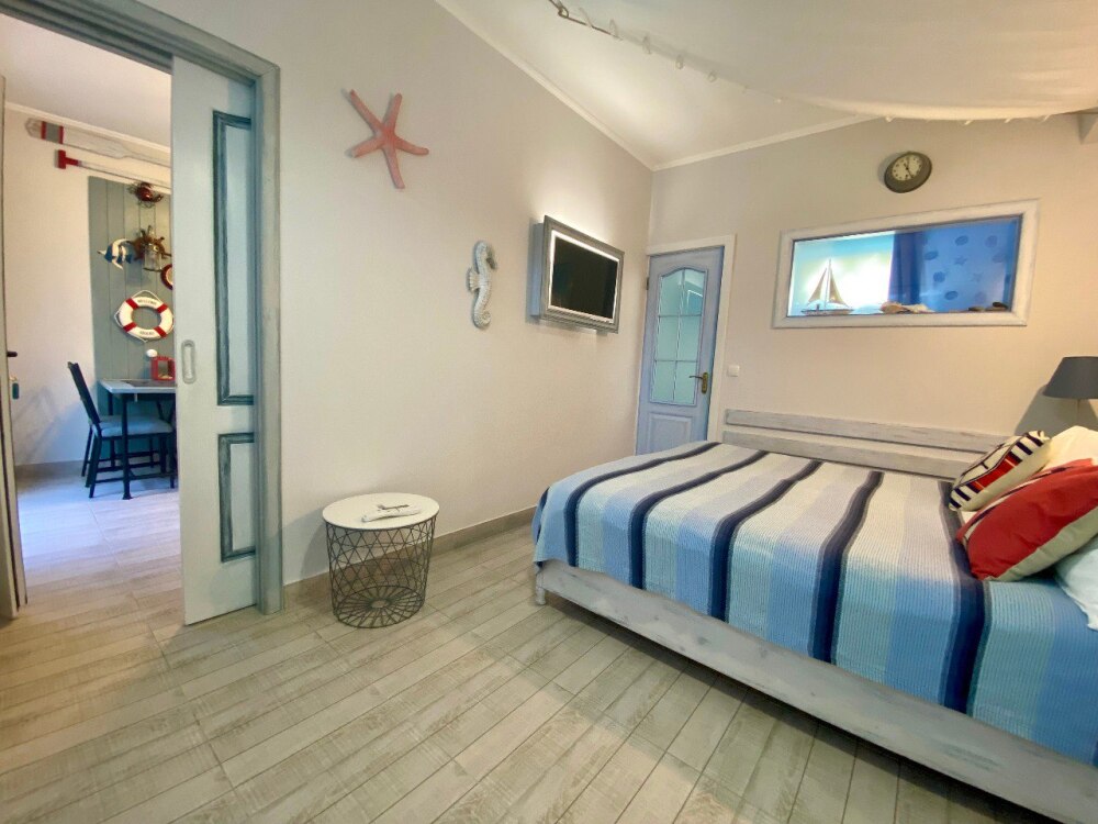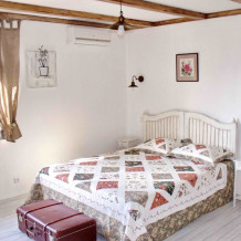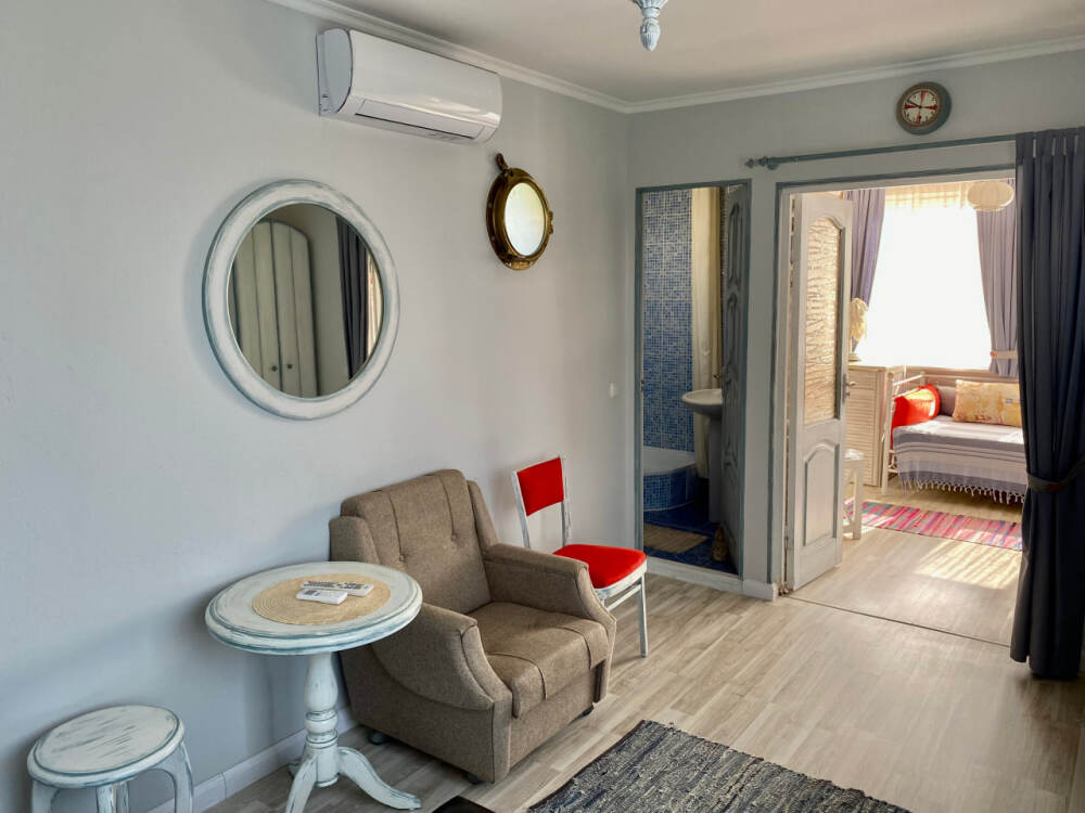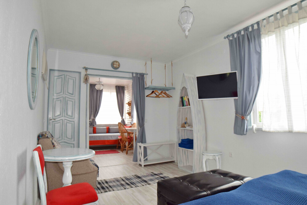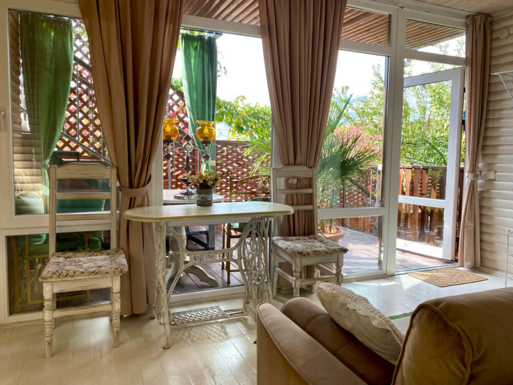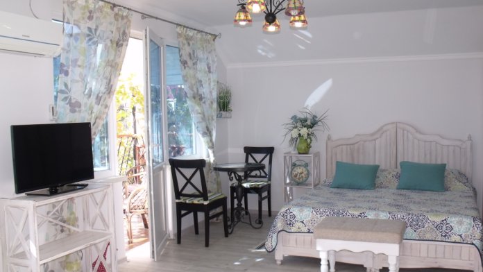 Уютный, стильный номер, имеет все необходимое для комфортного проживания: большая двуспальная кровать с ортопедическим матрасом, шкаф, кофейный столик, посуда,холодильник . В прохладное время года предусмотрен подогрев пола. Номер имеет собственную зону отдыха возле номера ( свой столик возле номера в виноградной беседке).
