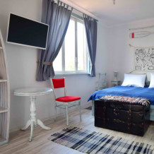 Небольшое количество номеров, с собственными балконами, или столиками на природе, уютный, зеленый дворик с виноградными беседками, журчание фонтана, даже в самую жару дарят ощущение свежести и прохлады. Отличительной особенностью является наличие дизайнер тематических номеров. Здесь можно забронировать номер, выполненный в «морском стиле», «прованс», «кантри», «музыкальны».