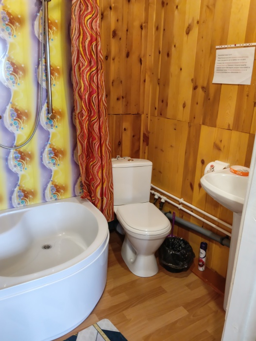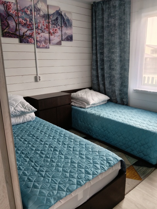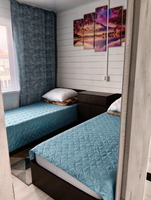 В номере расположена просторная комната с двумя кроватями 140/200 и 90/200, шкаф для хранения белья, прикроватные тумбы, постельное бельё, полотенца, телевизор,wi-fi. На кухне имеется вся необходимая посуда для комфортного проживания, электрическая плита, чайник, холодильник, микроволновая печь, в с/у есть душевая кабина, раковина для умывания, унитаз, туалетные принадлежности (зубные щетки, шампунь, мыло, тапочки).
