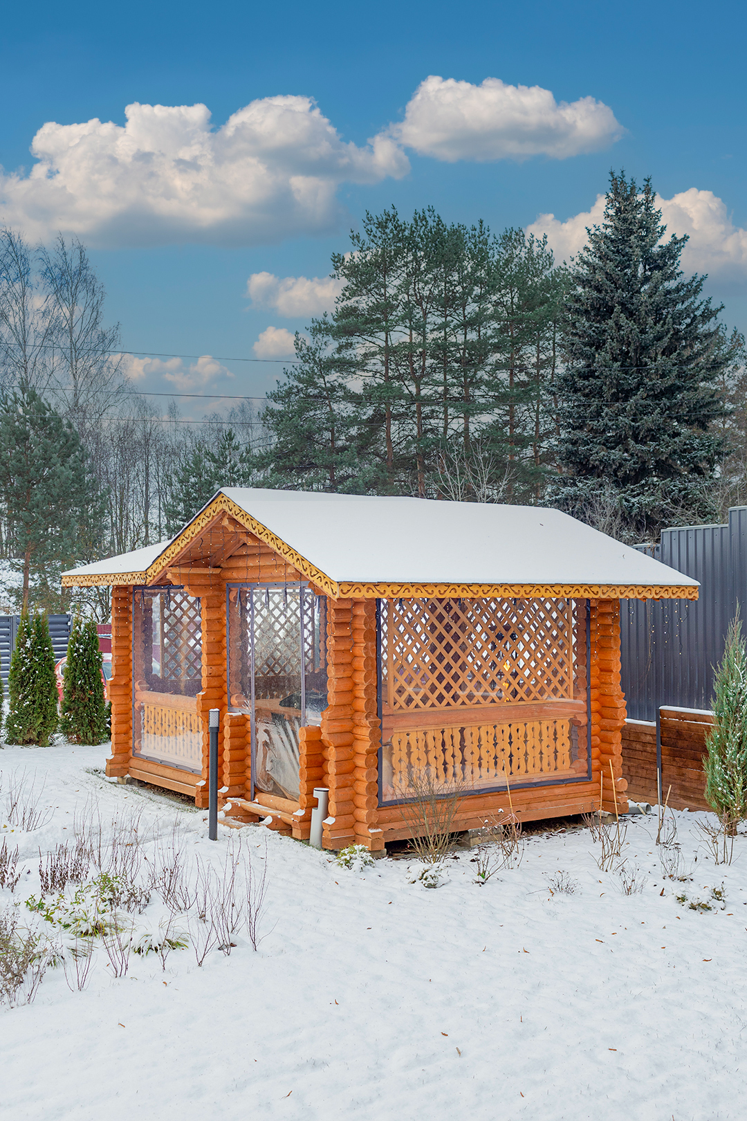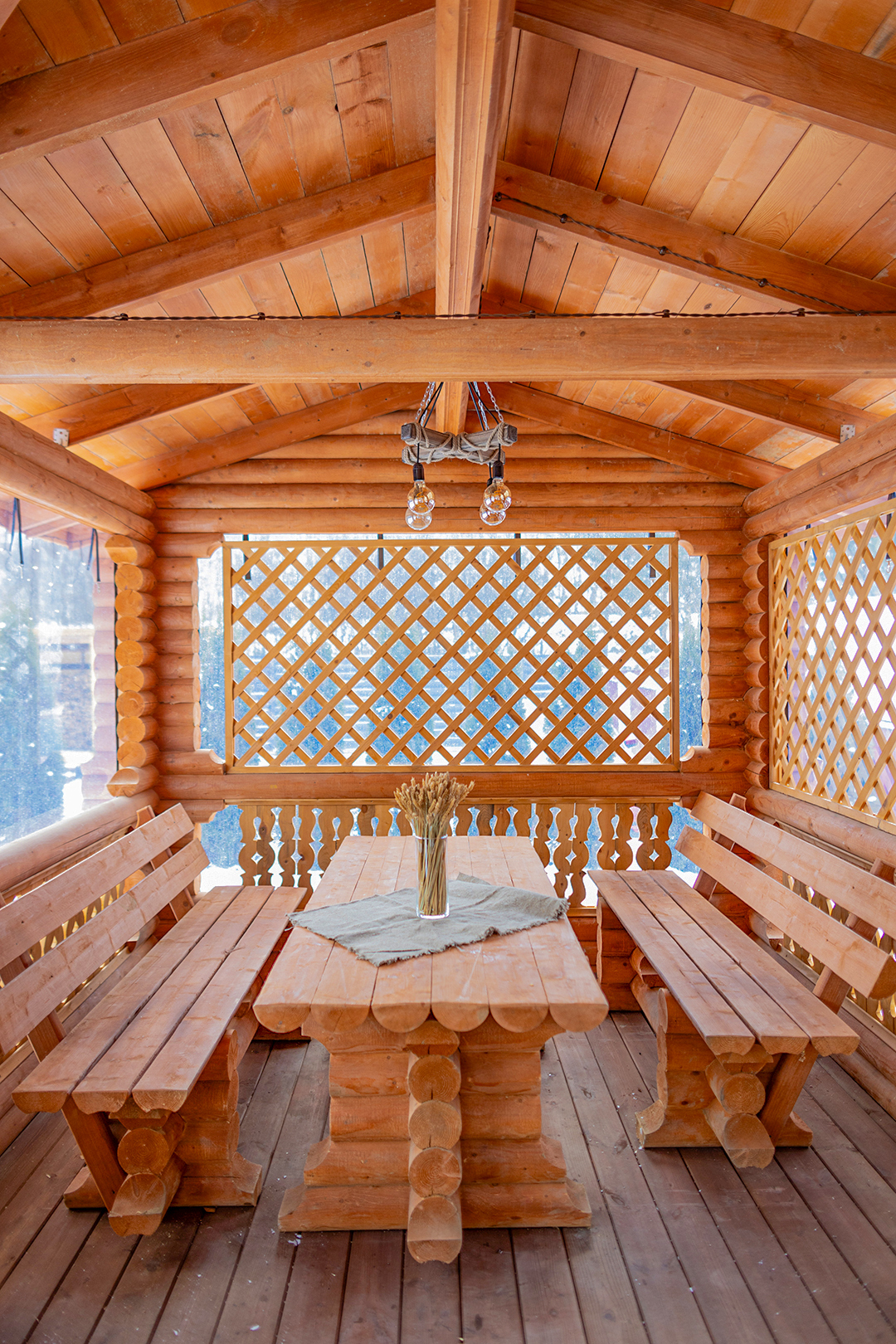 - Красивая беседка из оцилиндрованного бревна;