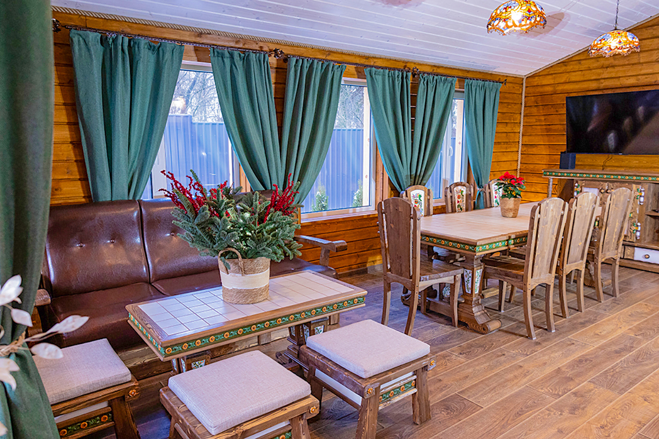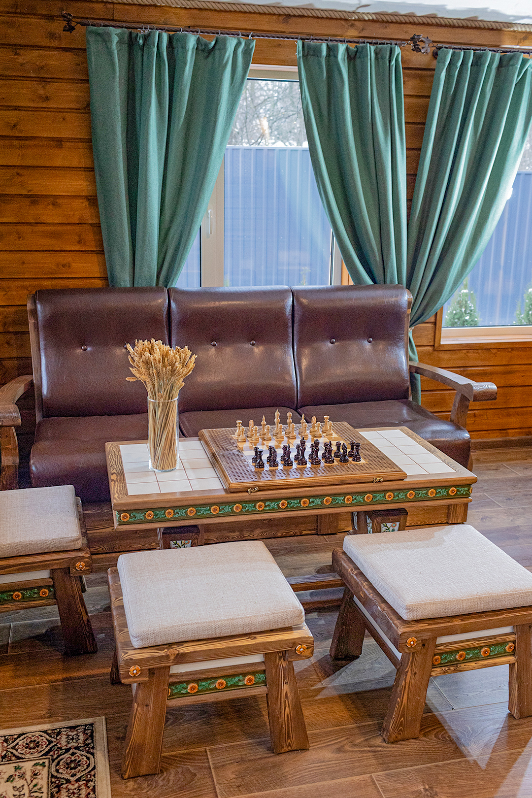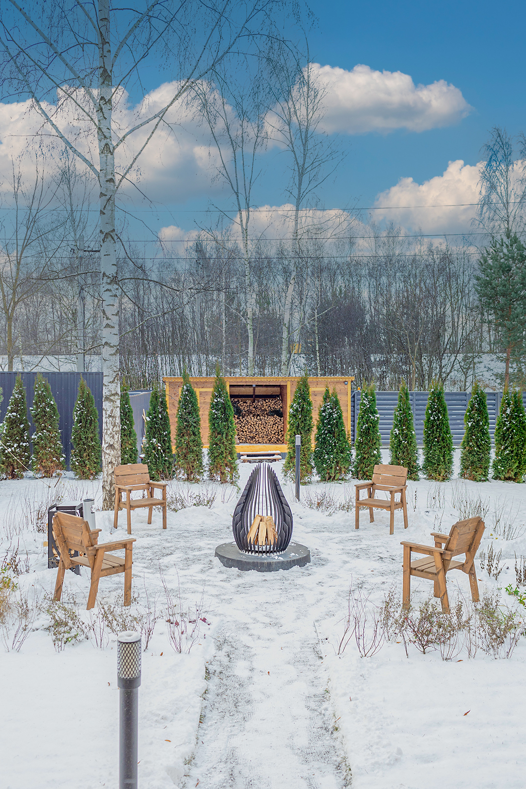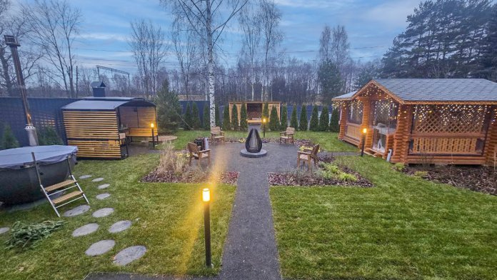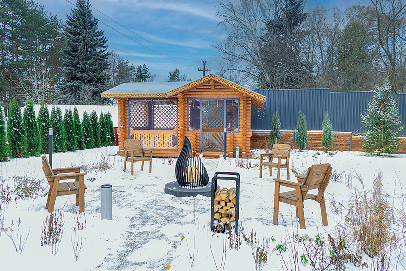 - Костровая зона с удобными деревянными креслами;