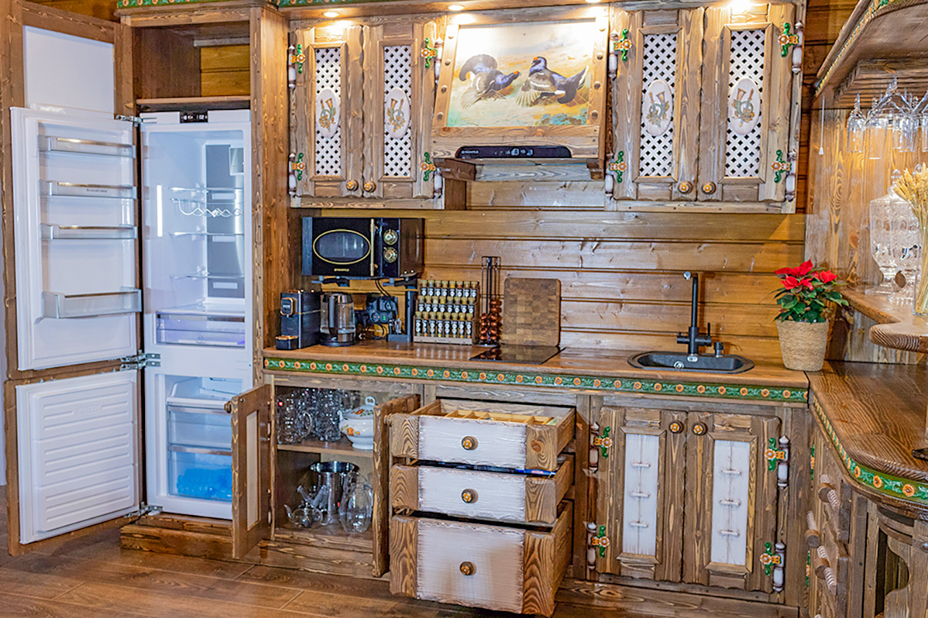 - Бытовая техника: холодильник с морозильником, микроволновая печь, капсульная кофемашина, чайник и плита;