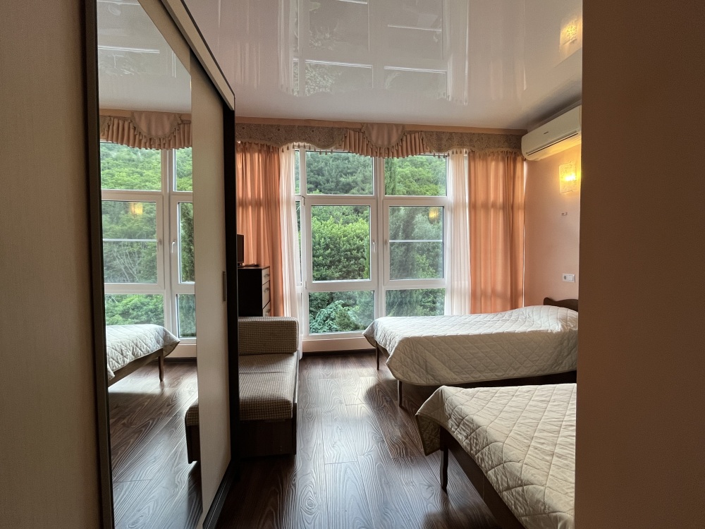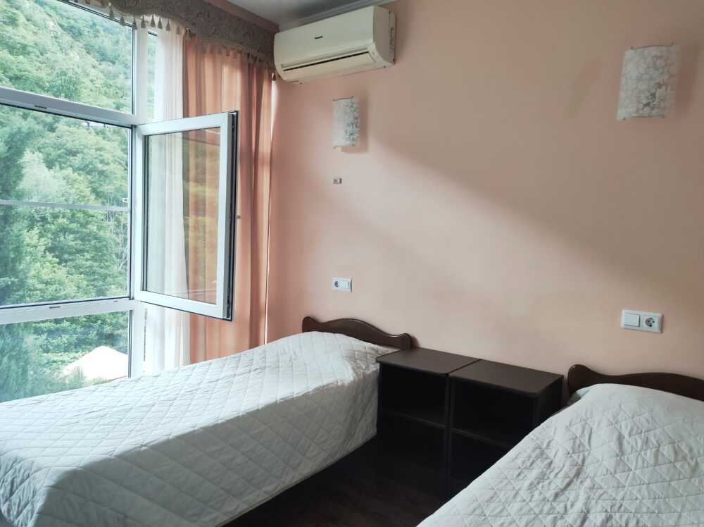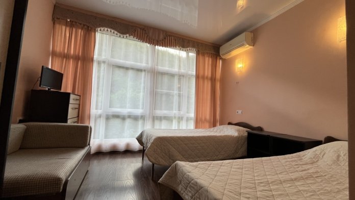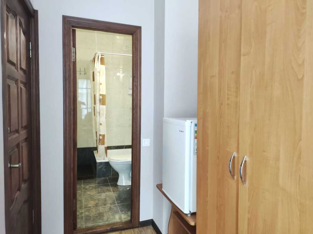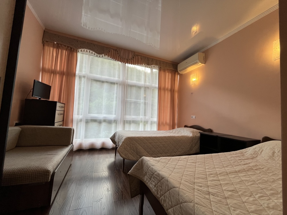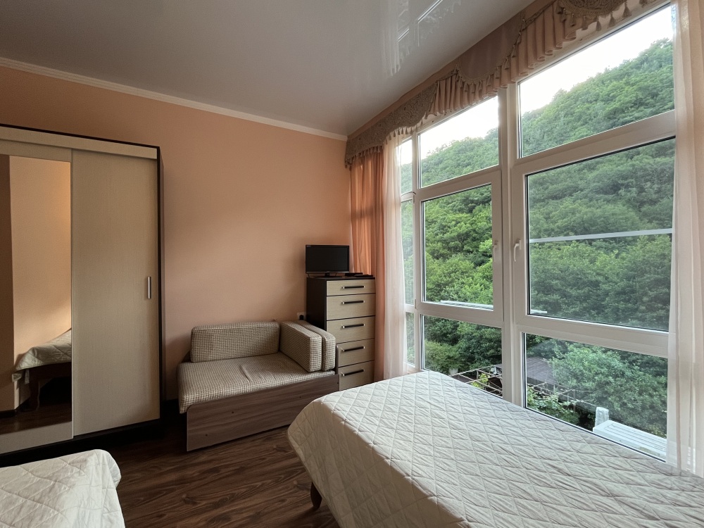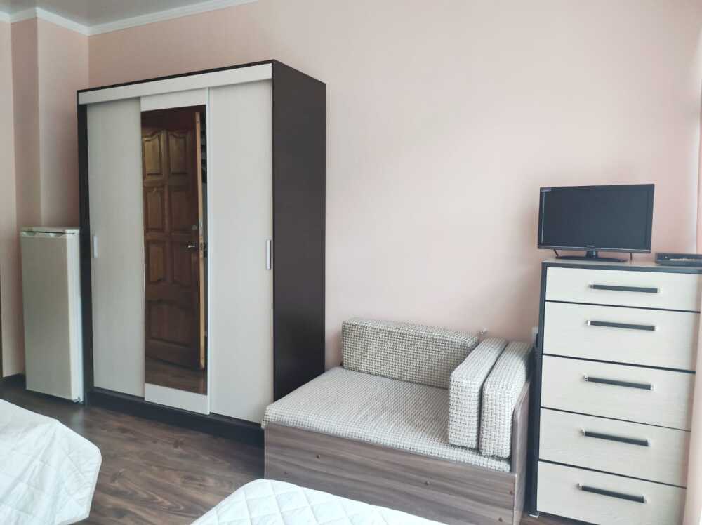 Однокомнатные номера стандарт площадью 18 кв. м. Панорамные витражные окна наполняют комнату светом и открывают вдохновляющий вид на горные вершины. В номере две односпальные кровати, а для третьего гостя предусмотрено раскладное кресло. Поддерживать идеальный микроклимат помогает сплит-система. В распоряжении гостей телевизор, холодильник и электрический чайник. За окном удобно расположена сушилка для белья. Индивидуальная ванная комната совмещена с душевой зоной.