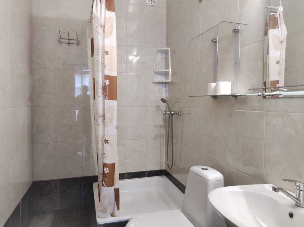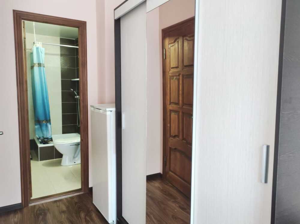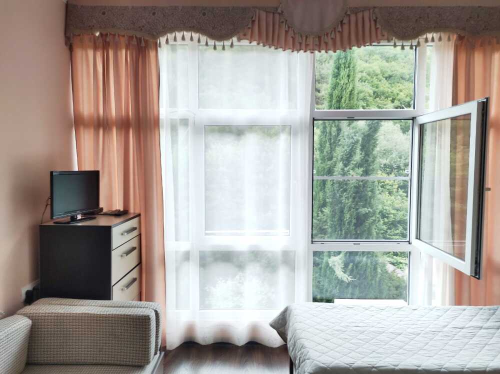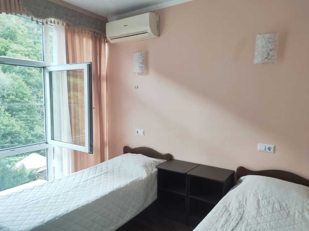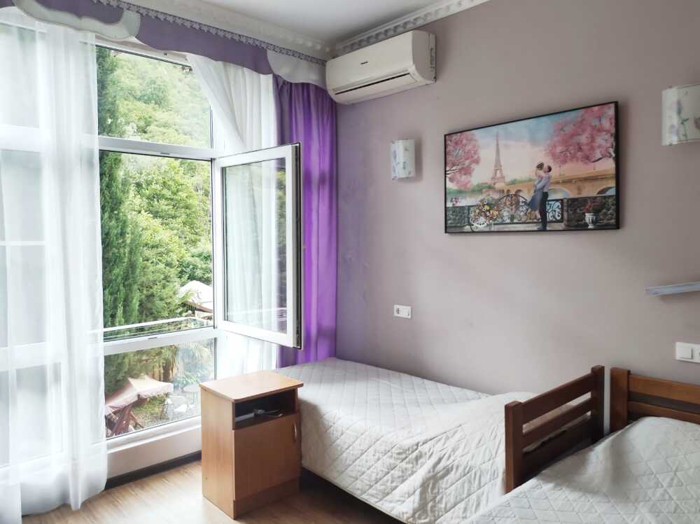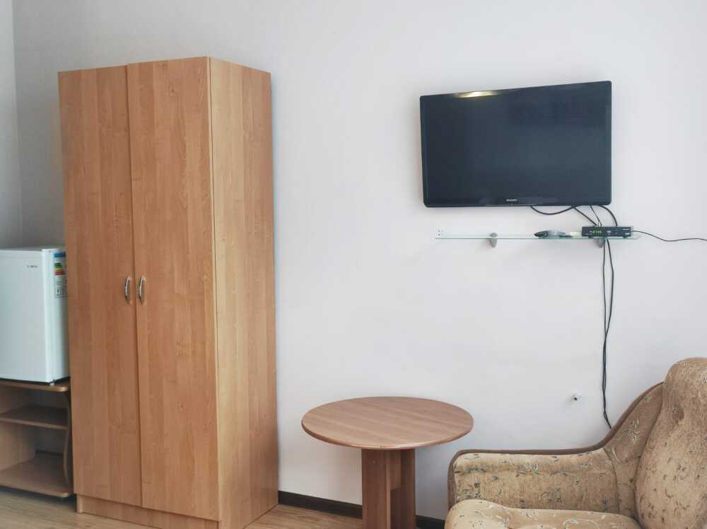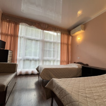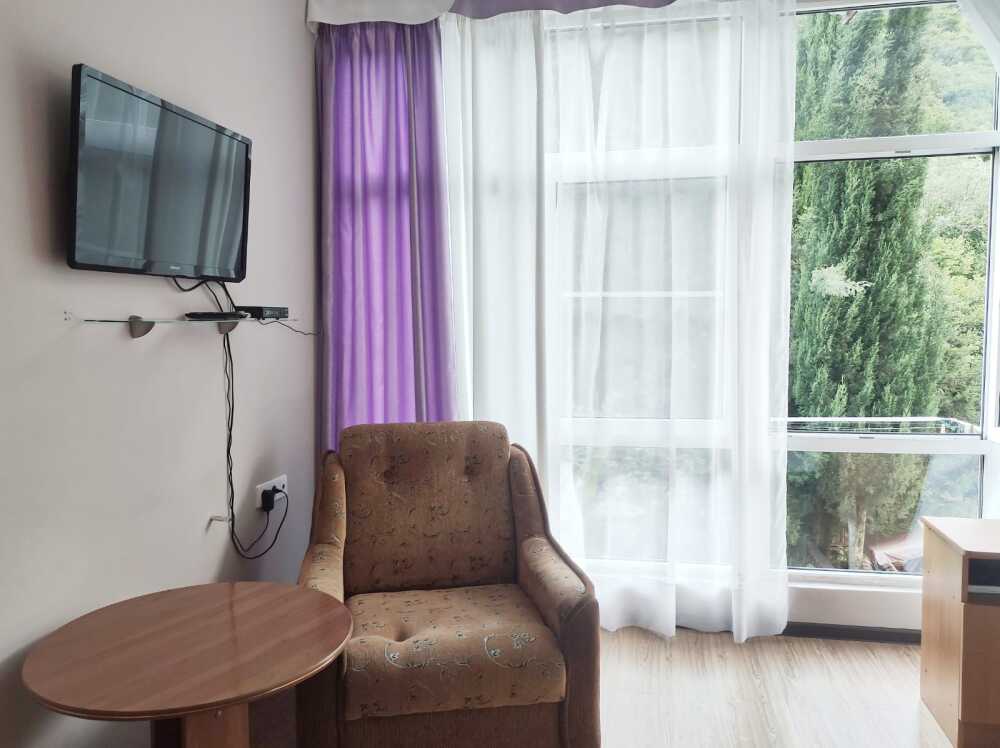 Однокомнатные номера стандарт площадью 18 кв. м. Панорамные витражные окна наполняют комнату светом и открывают вдохновляющий вид на горные вершины. В номере две односпальные кровати, а для третьего гостя предусмотрено раскладное кресло. Поддерживать идеальный микроклимат помогает сплит-система. В распоряжении гостей телевизор, холодильник и электрический чайник. За окном удобно расположена сушилка для белья. Индивидуальная ванная комната совмещена с душевой зоной.
