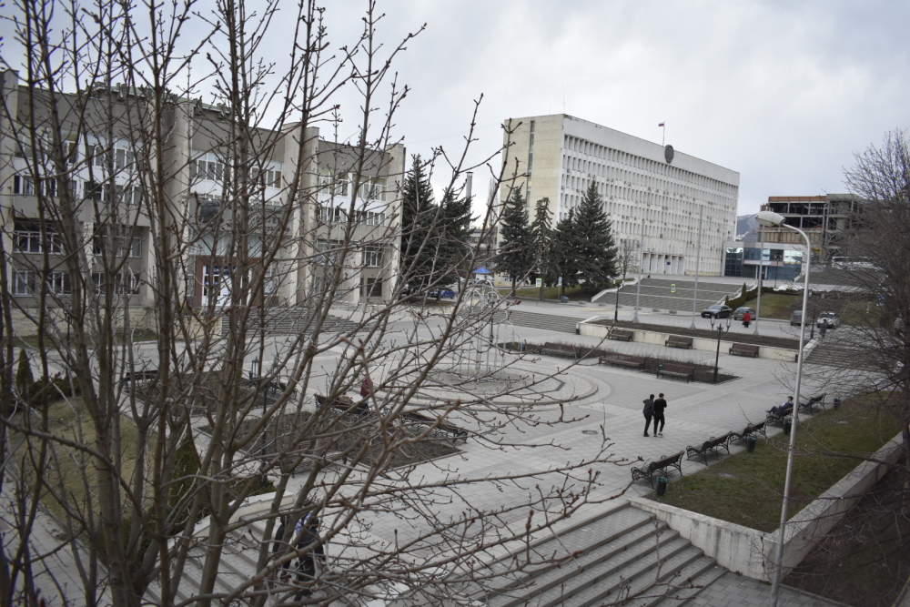 С балкона открывается вид на сквер городской библиотеки и администрации, а также небольшой фонтан.