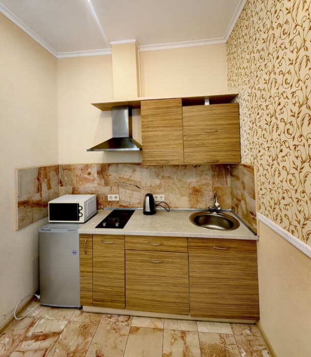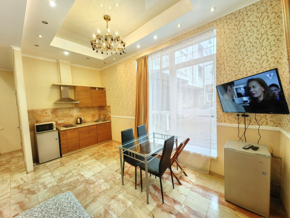 - бытовая техника: кондиционер, плоский телевизор с кабельным телевидением, Wi-Fi, мини-холодильник, двухконфорочная электрическая плита , электрочайник, микроволновая печь, кухонная вытяжка, водонагреватель, стиральная машина, а также утюг с гладильной доской, фен, сушилка для белья,