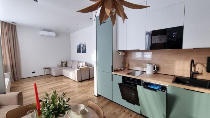 Полноценная кухня: холодильник, варочная панель, духовой шкаф, микроволновка, чайник, посудомоечная машина и вся необходимая посуда (в частности, кастрюли, сковороды, столовые приборы на 6 персон).