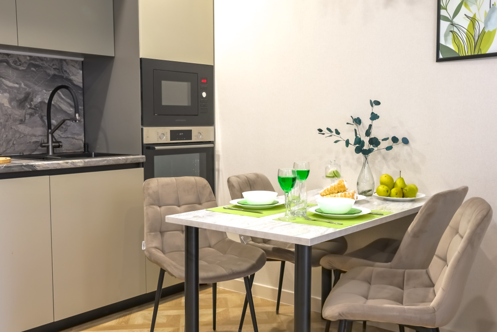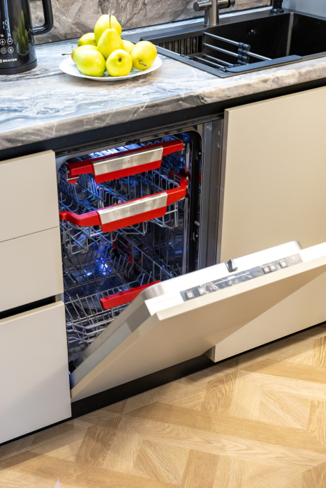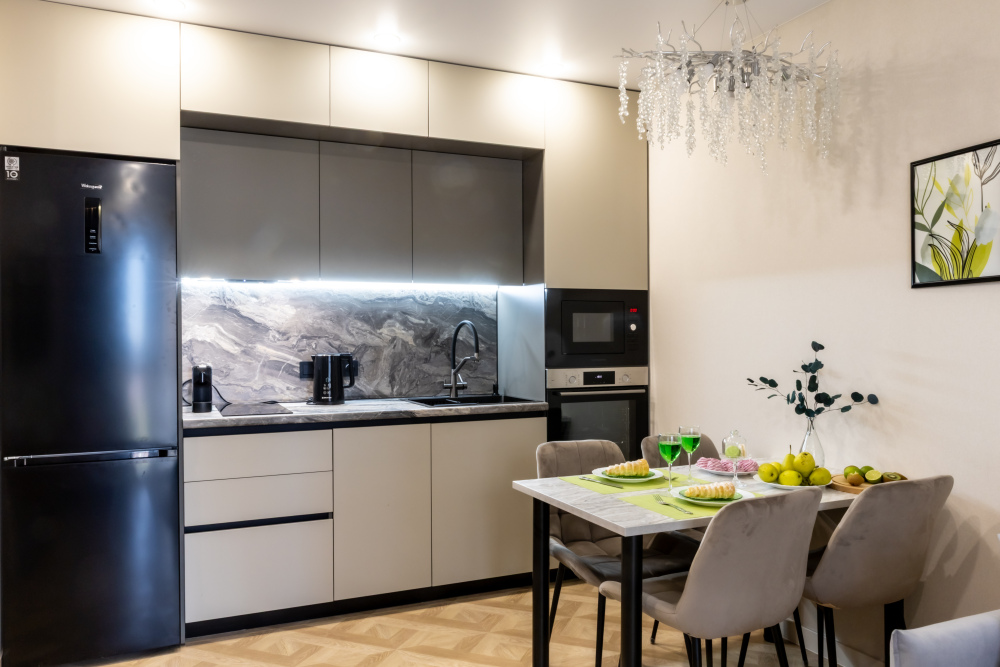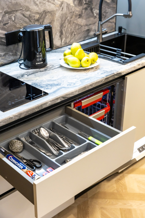 - Полностью оборудованная встроенная кухня: индукционная плита, духовка, микроволновка, посудомойка, капсульная кофемашина, чайник, фильтр воды.