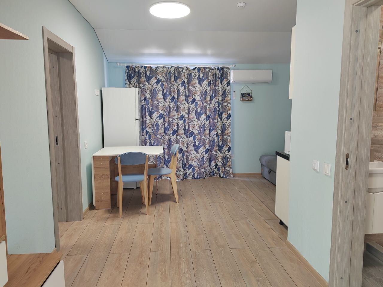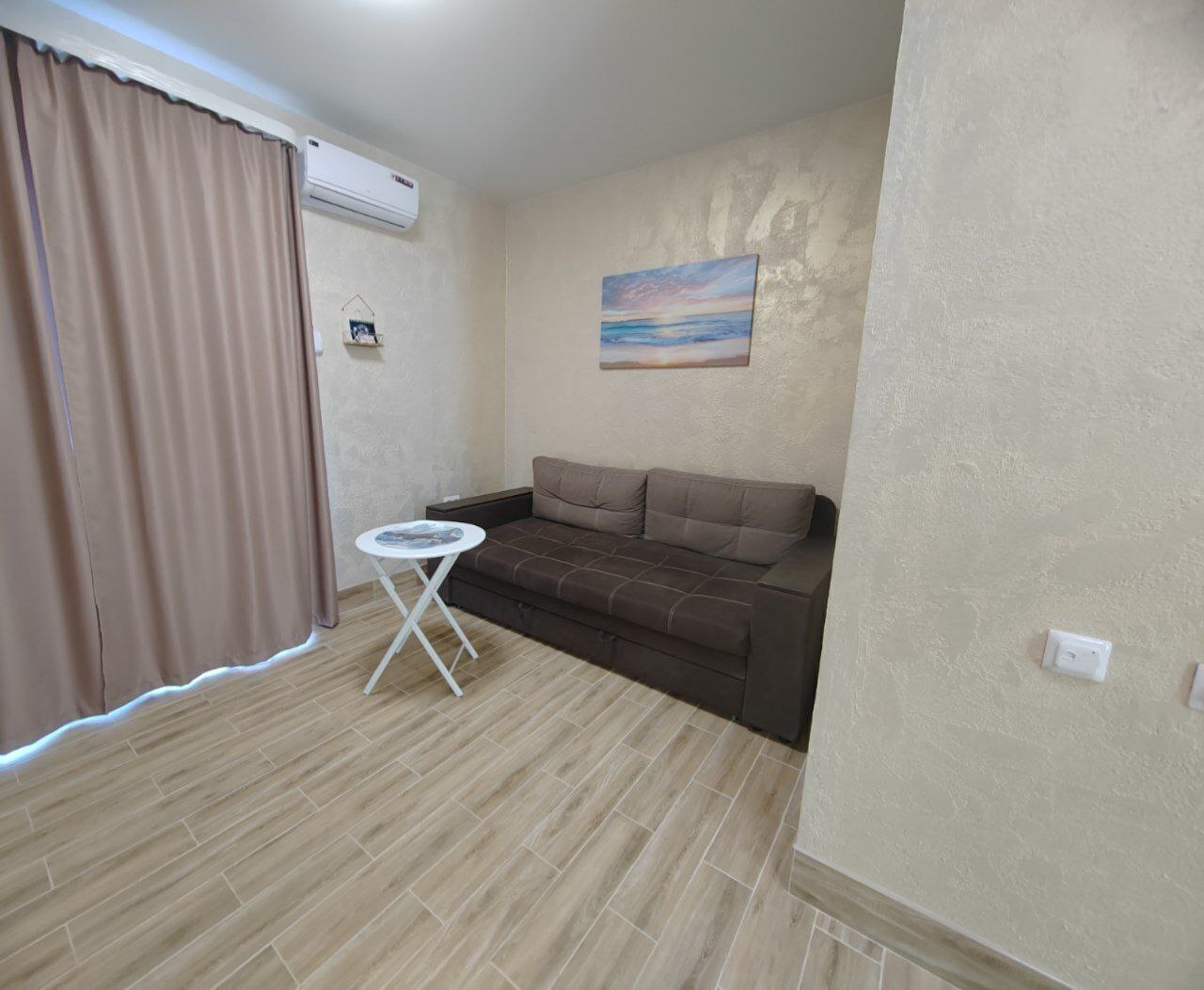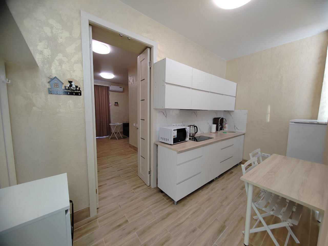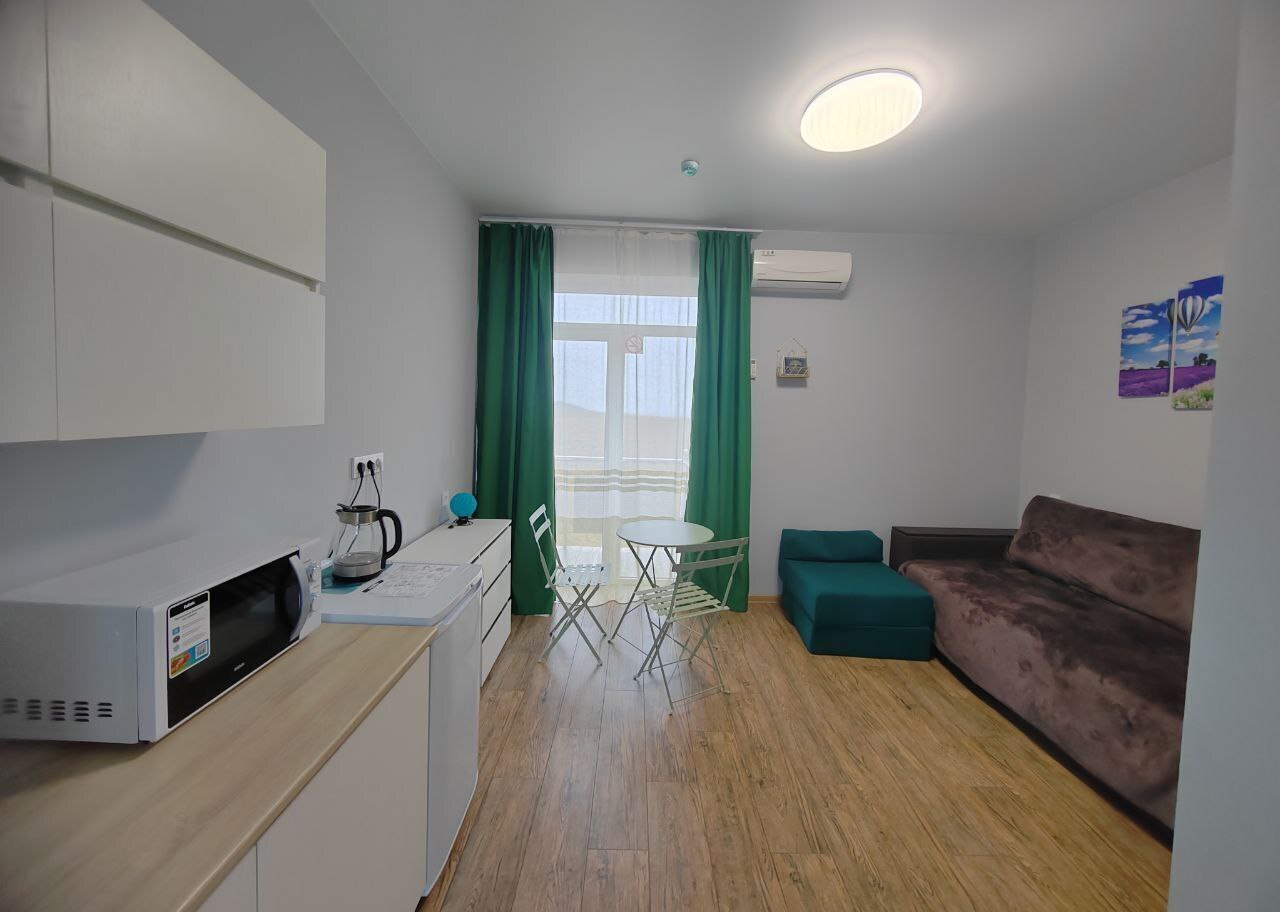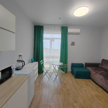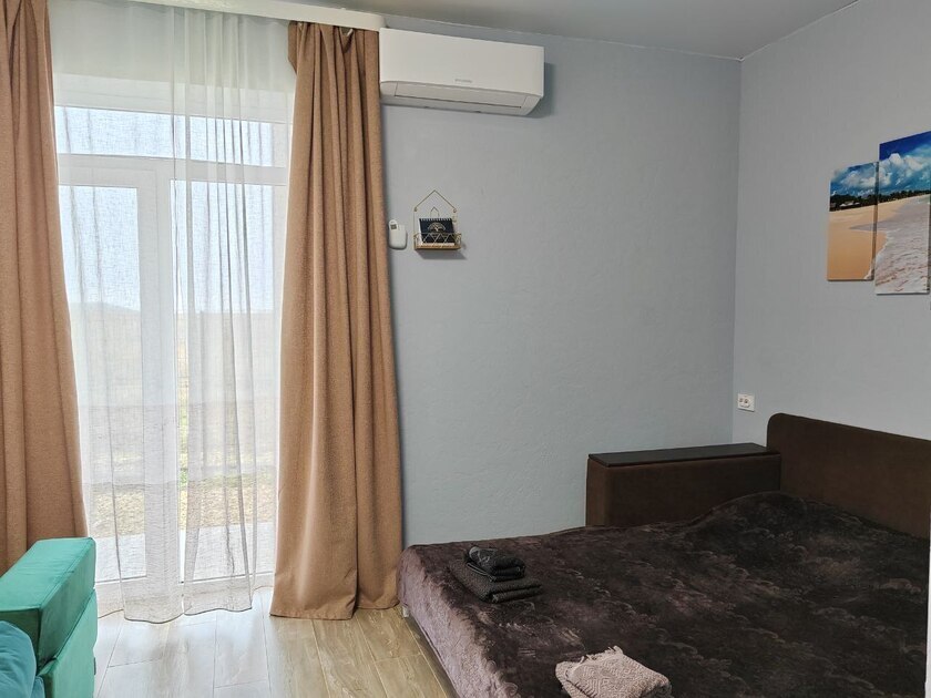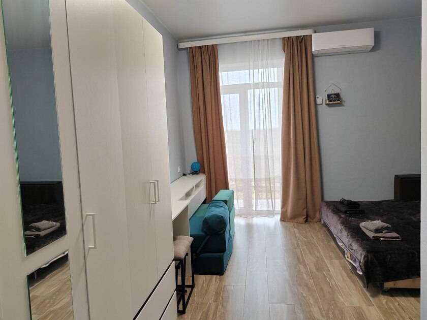 В этом варианте двуспальная кровать или комфортный раскладной диван. В номерах предусмотрено дополнительное спальное место очень комфортно отдыхать 2 взрослым и 1 ребенку. Рабочий стол, пуфик , шкаф для одежды, телевизор, кондиционер.Кухня-ниша, чайник, холодильник, микроволновая печь. Набор посуды на 3 персоны: десертные тарелки, плоские тарелки 28 см, суповые тарелки, столовые приборы, чайные пары, нож, вилки, ложки, разделочная доска, шкаф зеркало, полотенцесушитель, балкон