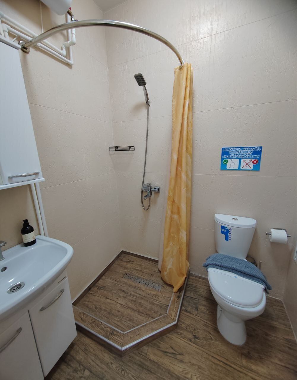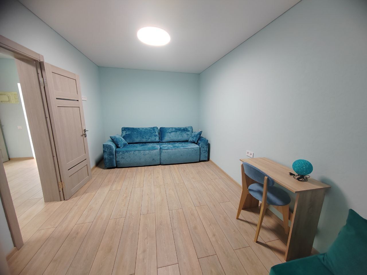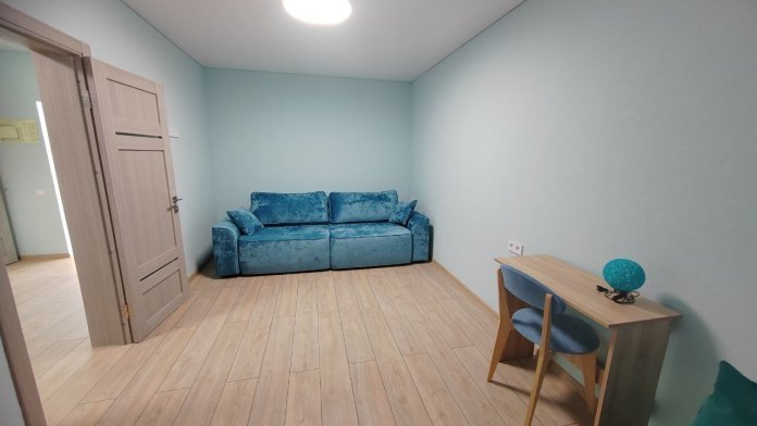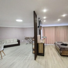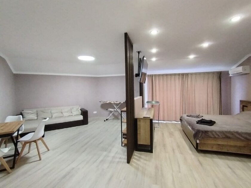 В номерах места хватит для 2 взрослых и до 2 детей. В этом варианте двуспальная кровать и дополнительные комфортные спальные места предусмотрены. Рабочий стол, пуфик, шкаф для одежды, телевизор, кондиционер. Полноценная кухня, чайник, холодильник, микроволновая печь, вытяжка, обеденный стол. Набор посуды на 5 персон. Шкаф-зеркало, полотенцесушитель.